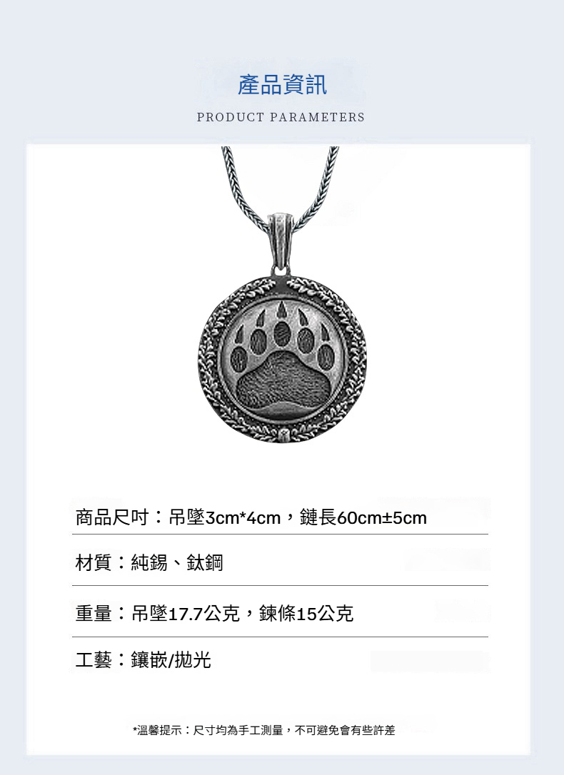 附專用飾品包裝盒.收納盒.禮品袋.送人有面子有質感整套包裝.送禮自用超有面子👜 商品尺吋:吊墜3cm*4cm,鏈長60cm±5cm👜 材質:純錫、鈦鋼👜 重量:吊墜17.7公克,鍊條15公克👜 工藝:鑲嵌/拋光