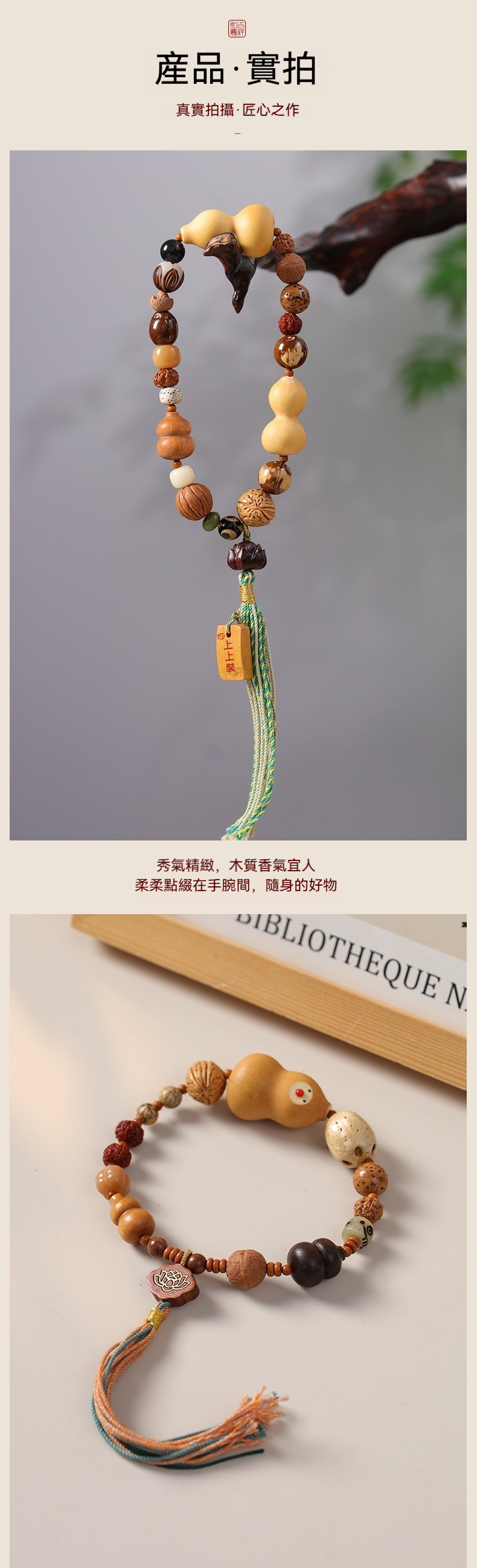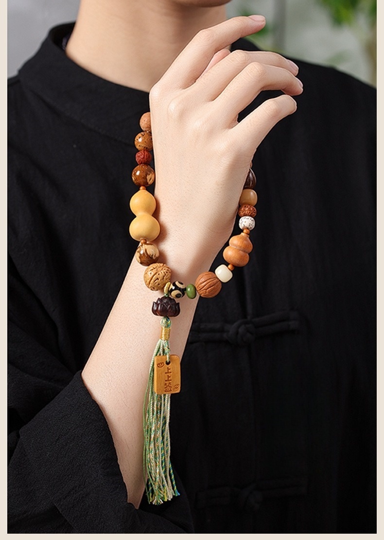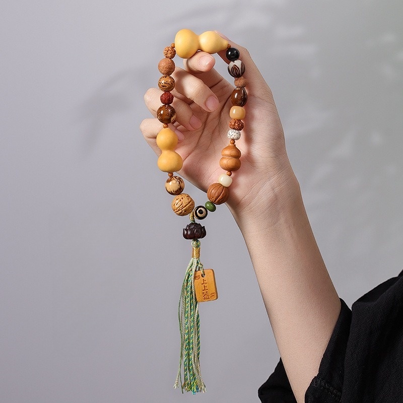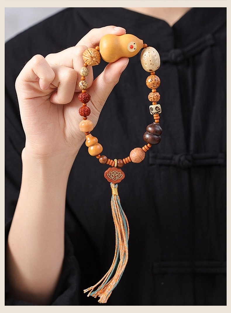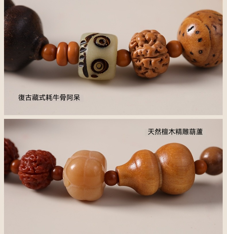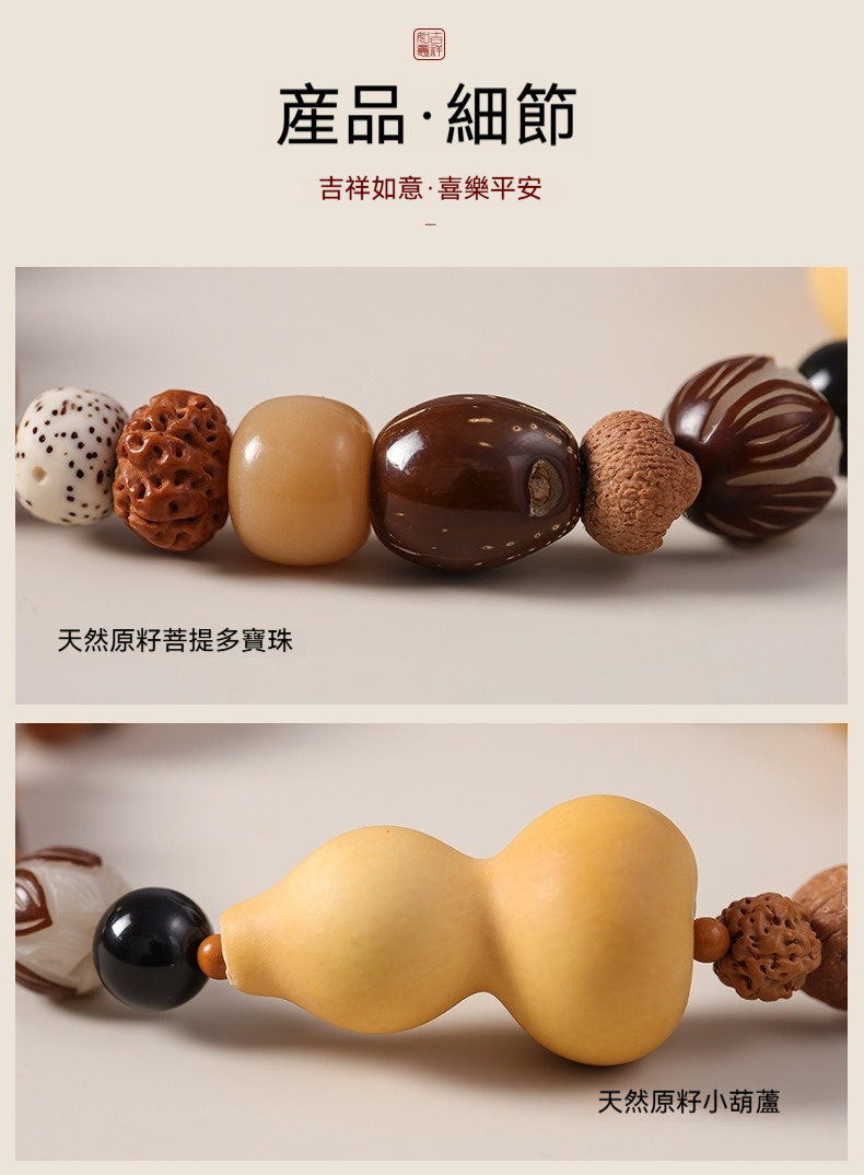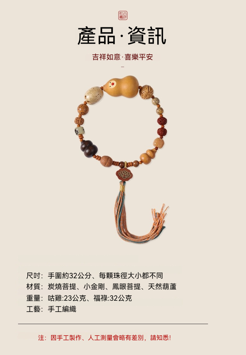 附專用飾品收納盒、禮品袋,送人超有質感、有面子✨ 商品尺吋:手圍約32公分、每顆珠徑大小都不同✨ 材質:炭燒菩提、小金剛、鳳眼菩提、天然葫蘆✨ 重量:咕雞:23公克、福祿:32公克✨ 工藝:手工編織