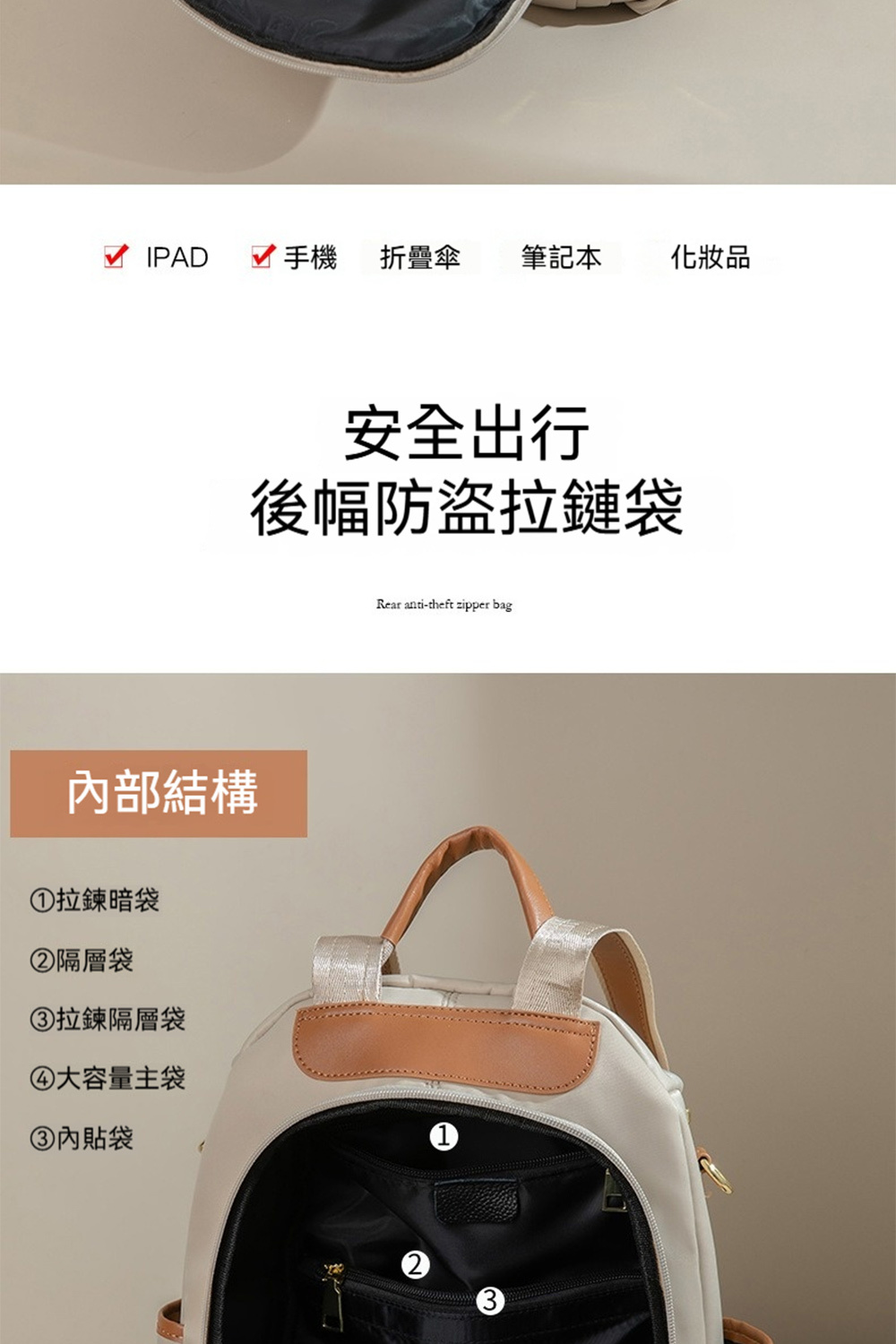 👜結構:拉鍊暗袋、隔層袋、拉鍊隔層袋、主袋、內貼袋、頂部拉鍊袋、側口袋*2、前幅拉鍊袋