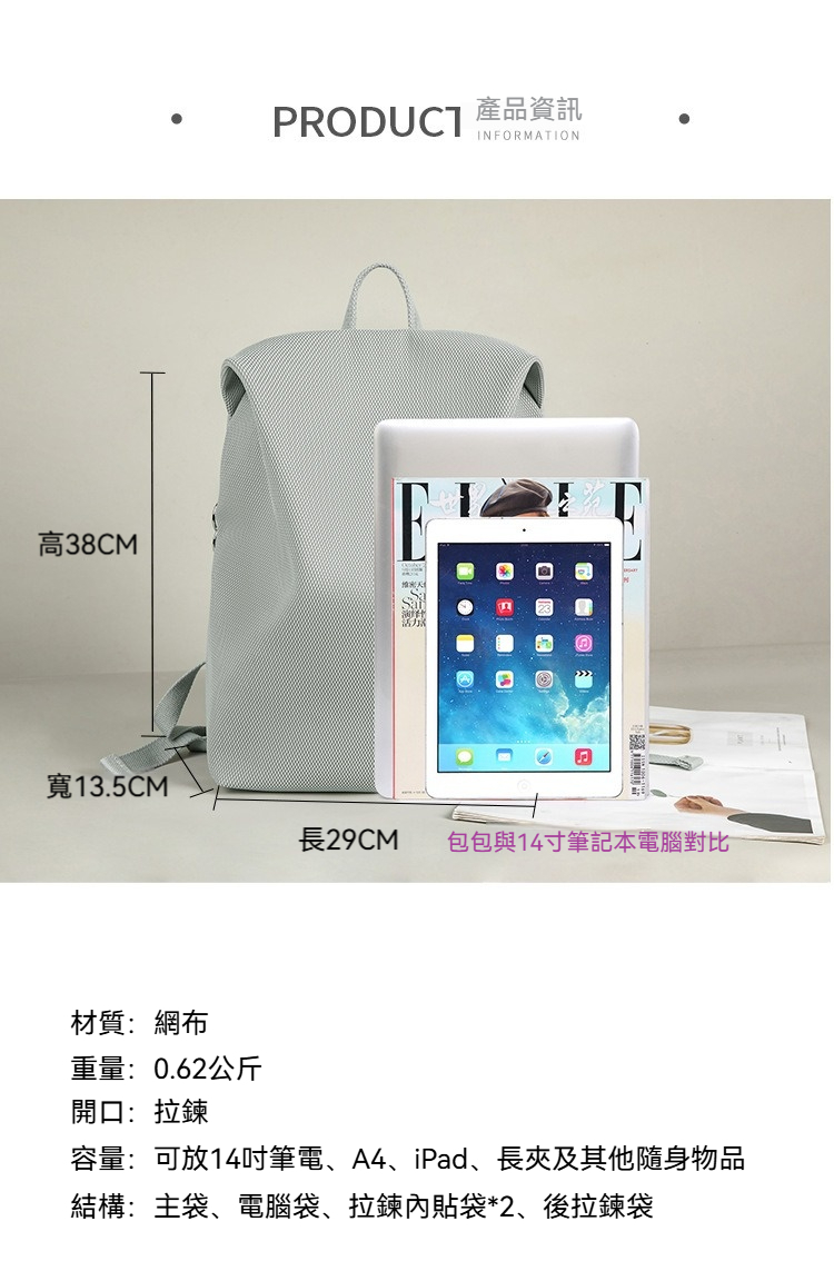 👜容量:可放14吋筆電、A4、iPad、長夾及其他隨身物品