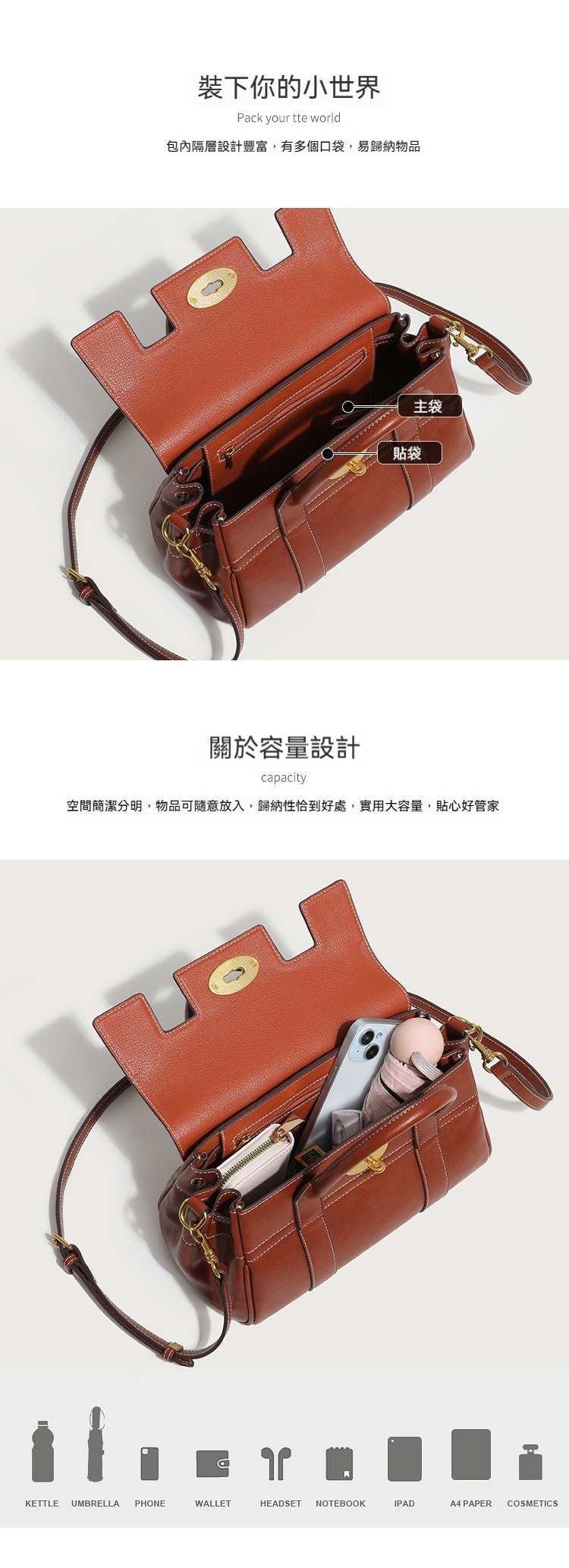 👜結構:主袋、拉鍊內貼袋、內貼袋