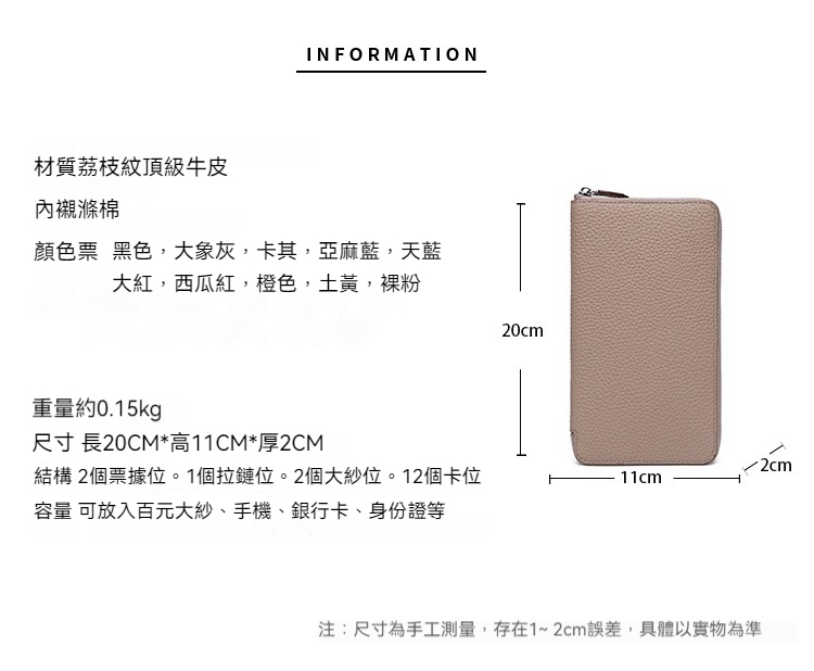 👜容量 / 結構:鈔票位*2、 卡片位*8、暗層*2、拉鏈袋*1