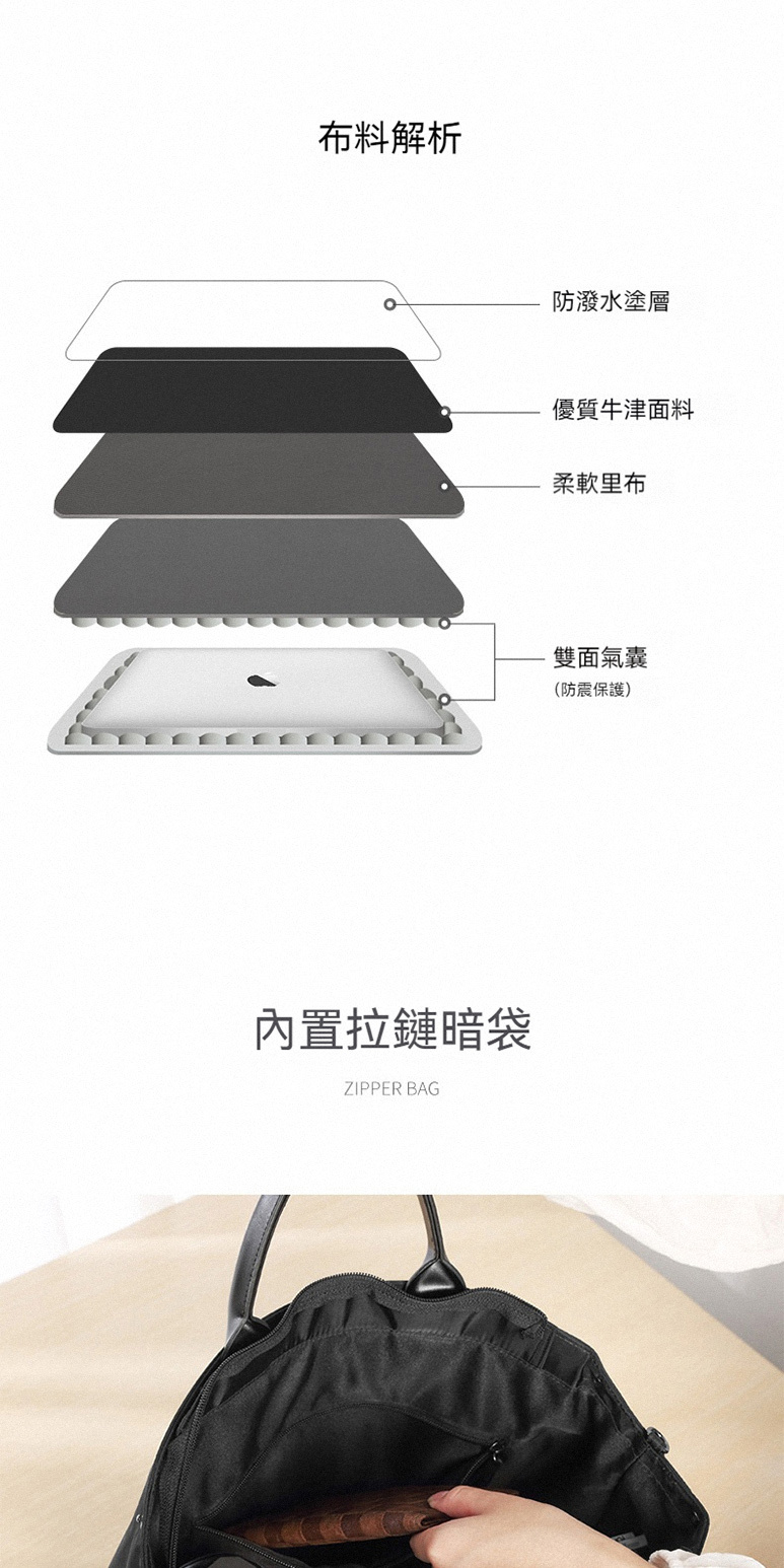 👜結構:主袋、緩衝隔層、拉鍊內貼袋