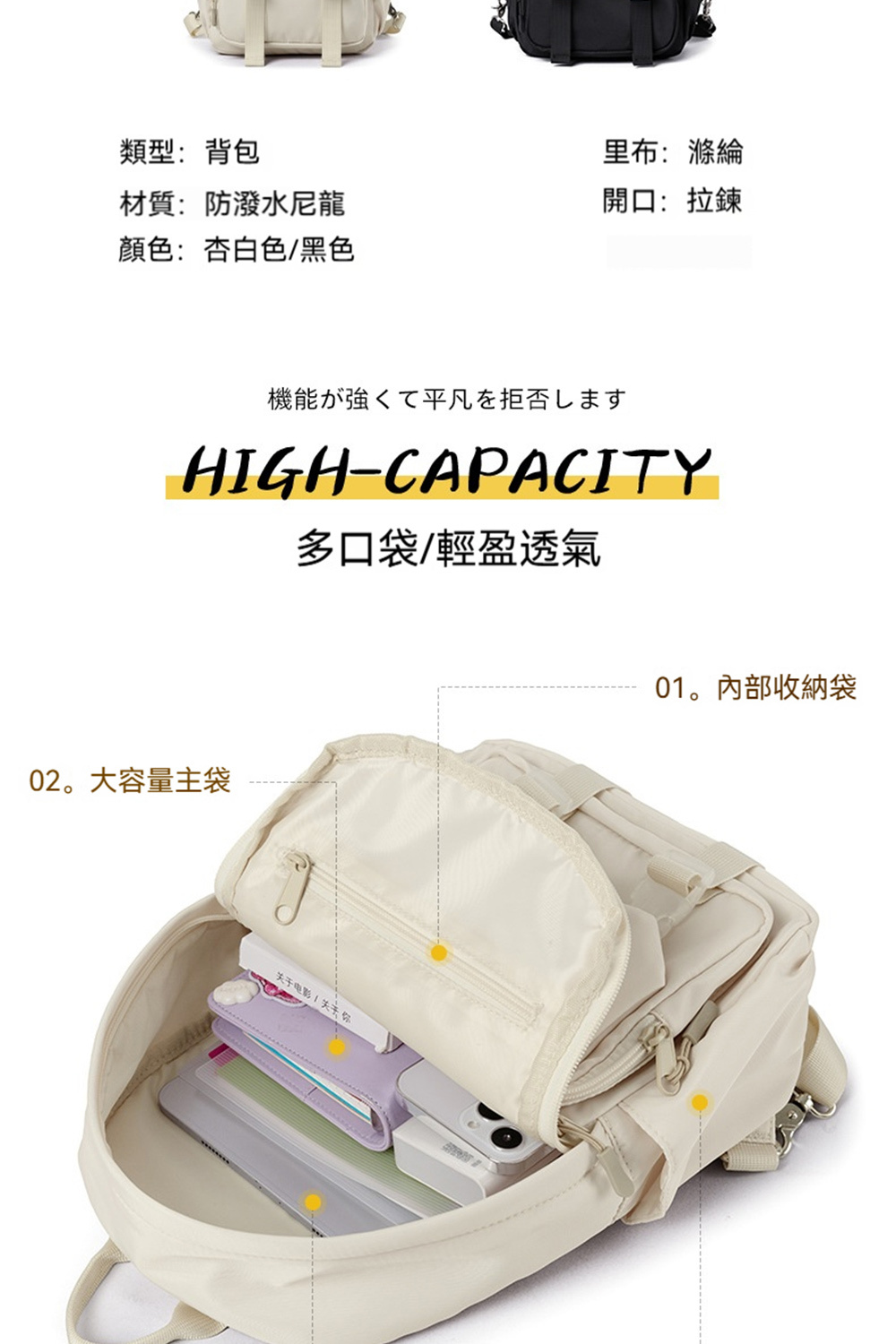 👜結構:主袋、內貼袋、拉鍊內貼袋、前置拉鍊袋*2、兩側插袋、後幅拉練貼袋