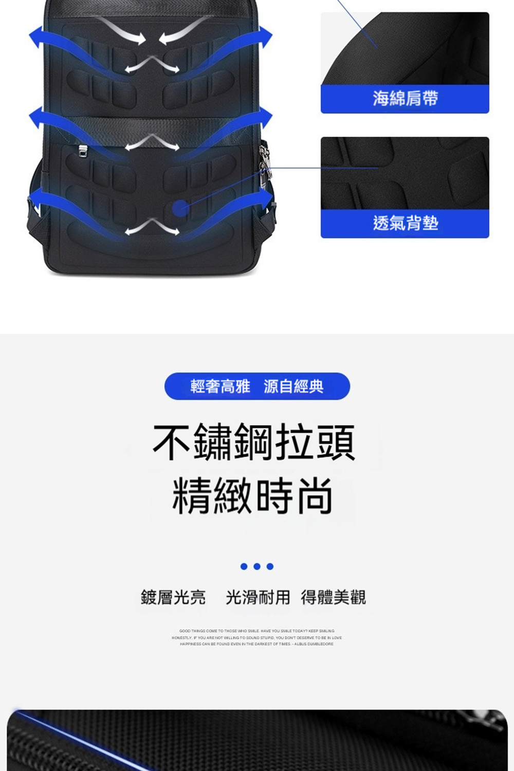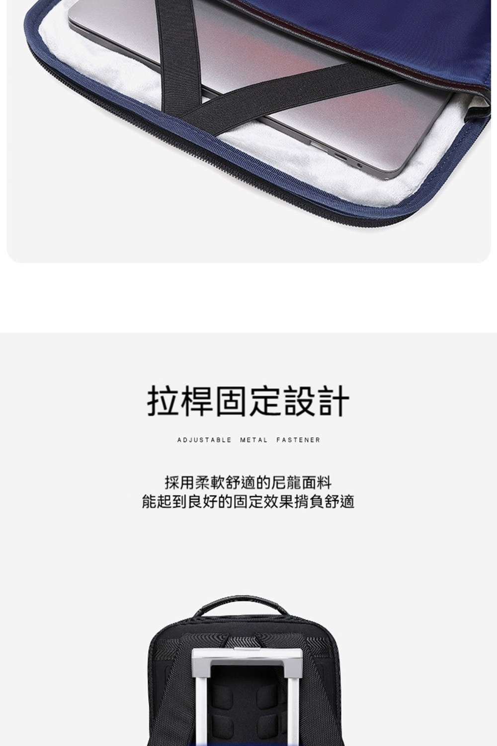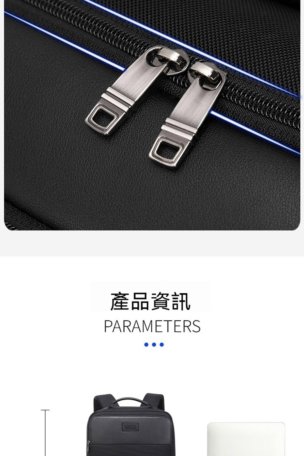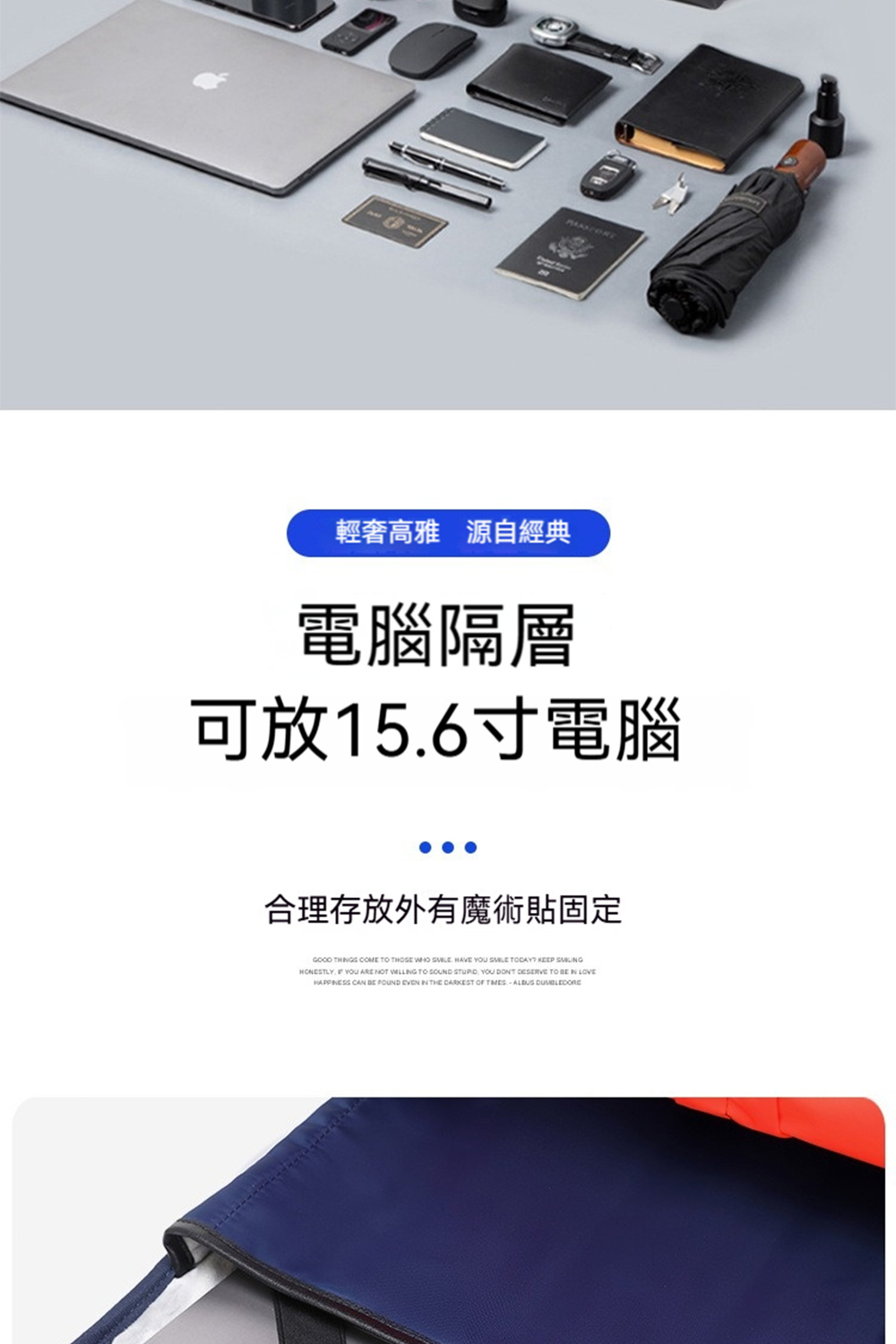 👜結構:15.6吋電腦隔層、前拉鍊袋*1、側袋*1、主袋、內貼袋*2+拉鍊袋*1