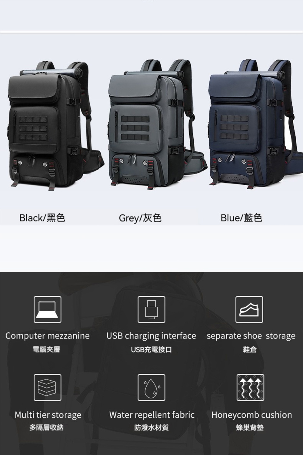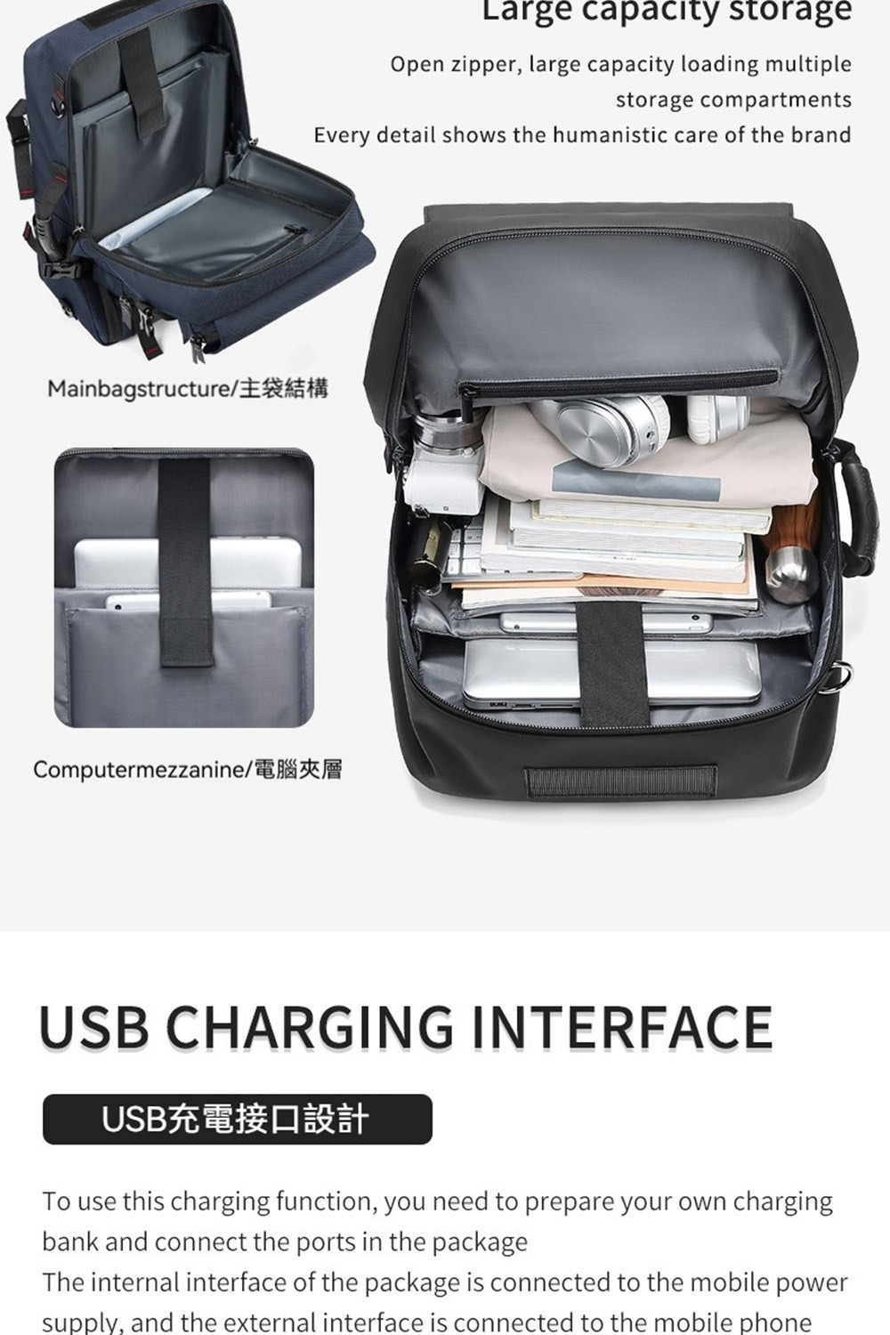 👜結構:主袋、拉鍊內貼袋、內貼袋、電腦隔袋、前拉鍊袋*4、側袋*1