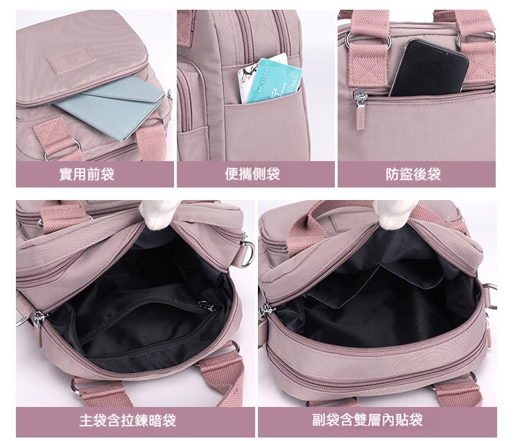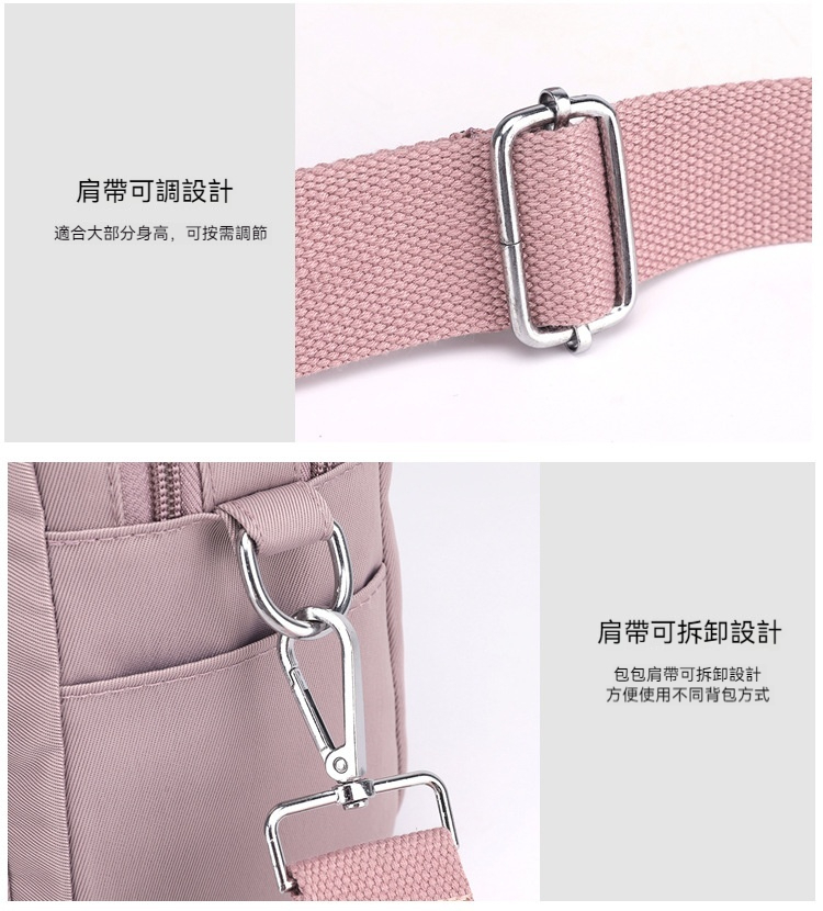 👜結構:雙主袋、內貼袋*2、拉鍊內貼袋、前置拉鍊袋、後幅拉鍊貼袋,附可調式長背帶
