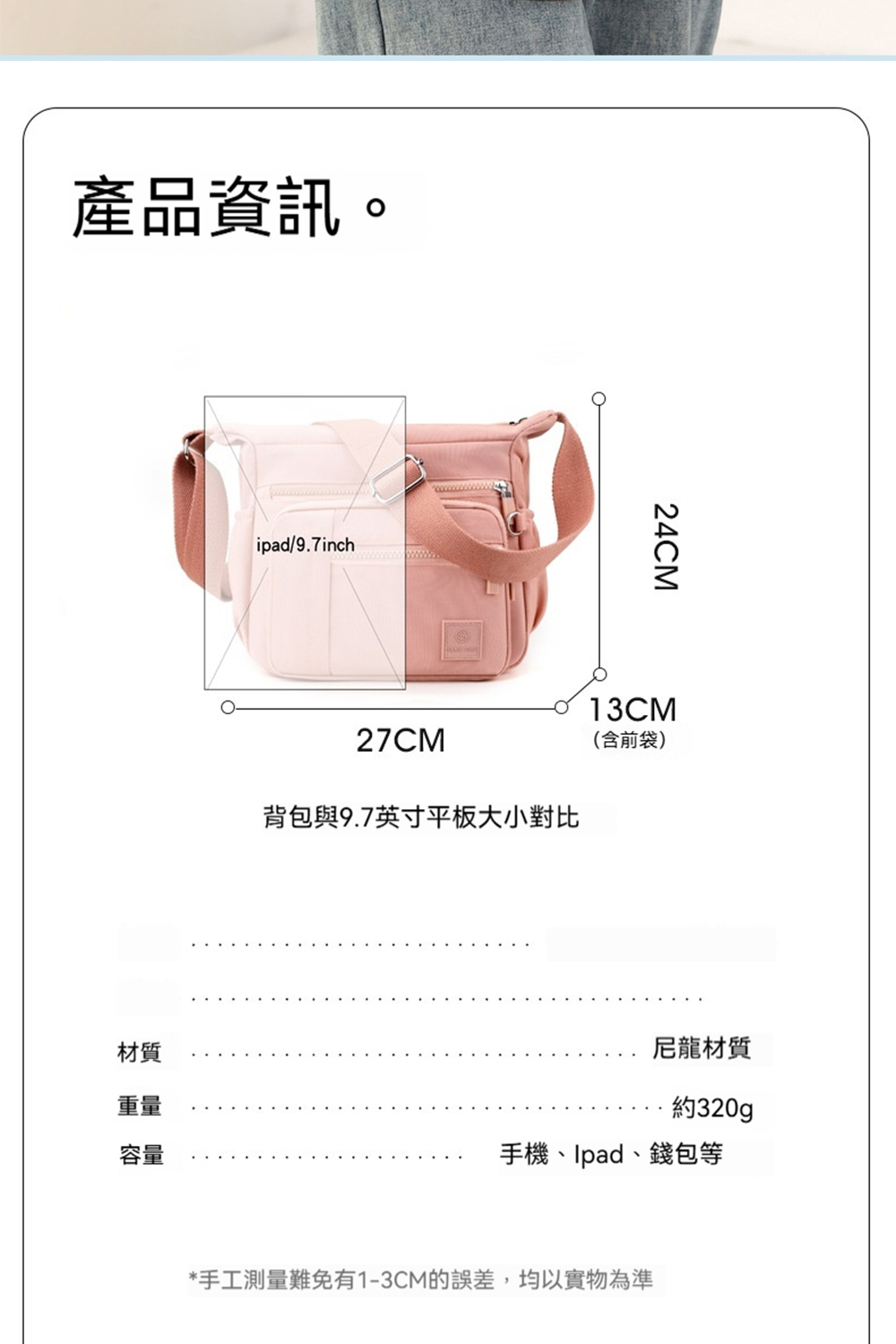 👜容量:可放9.7吋iPad、手機、長夾及其他隨身物品