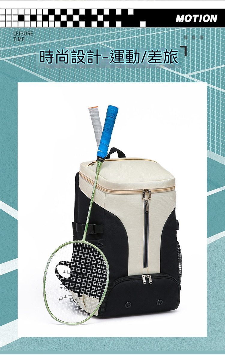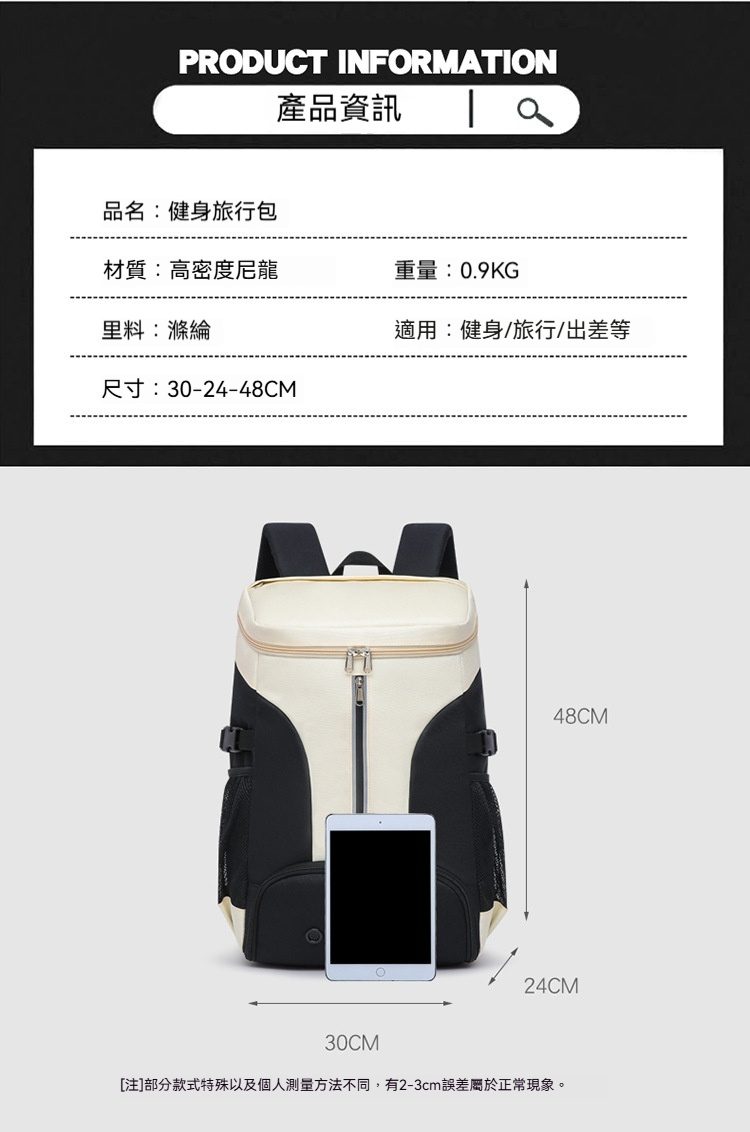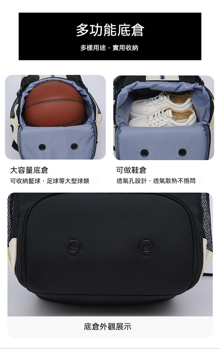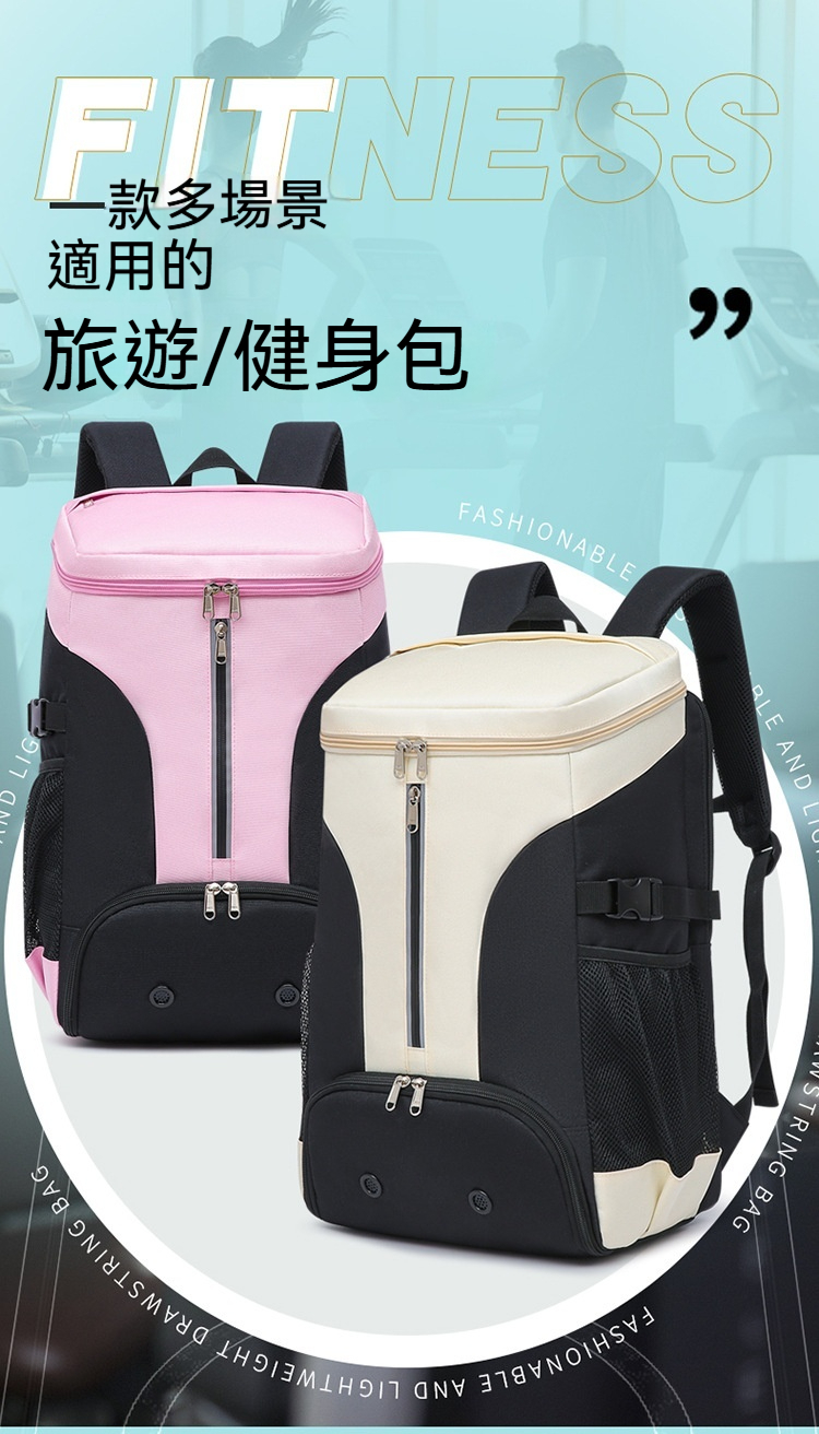 👜結構:主袋、緩衝隔層、上蓋拉鍊袋、前置拉鍊鞋倉、前幅拉鍊袋、兩側插袋、副袋