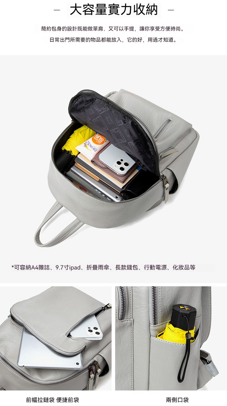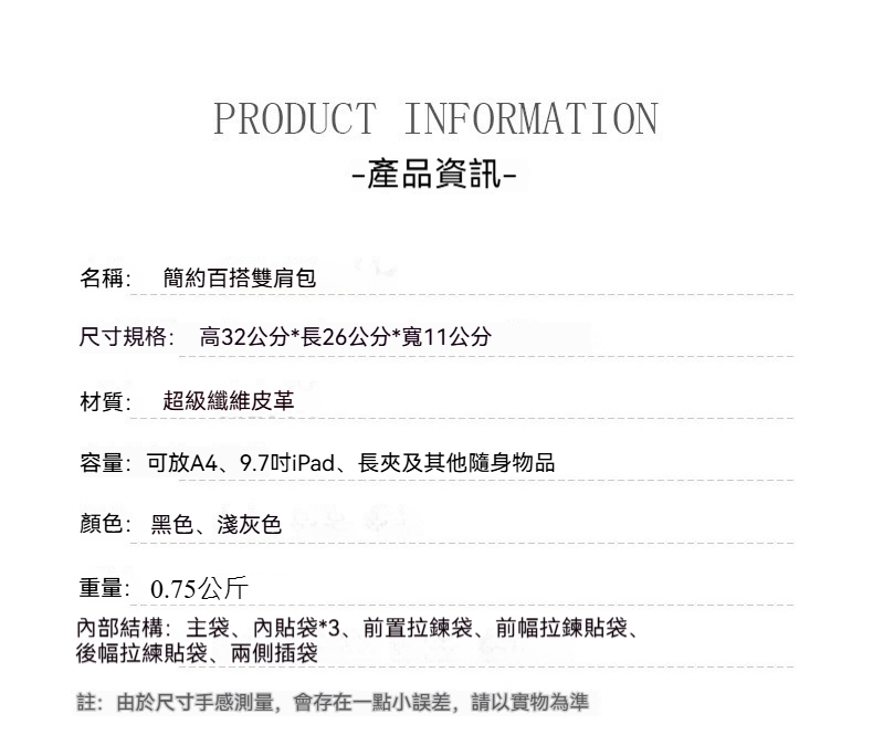 👜容量:可放A4、9.7吋iPad、長夾及其他隨身物品
