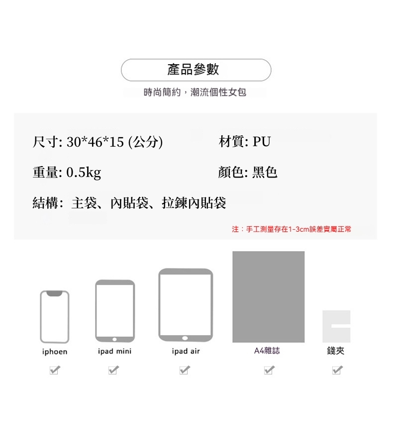 👜容量:可放A4、iPad、長夾及其他隨身物品