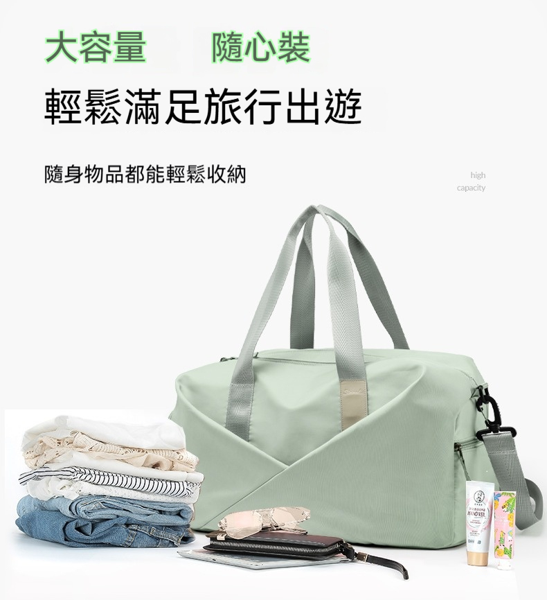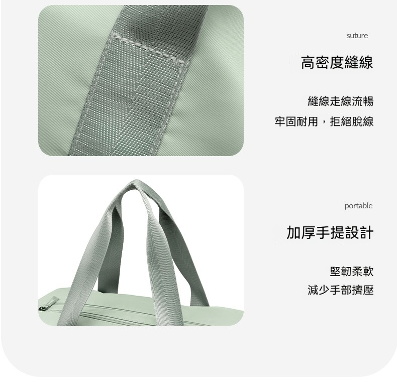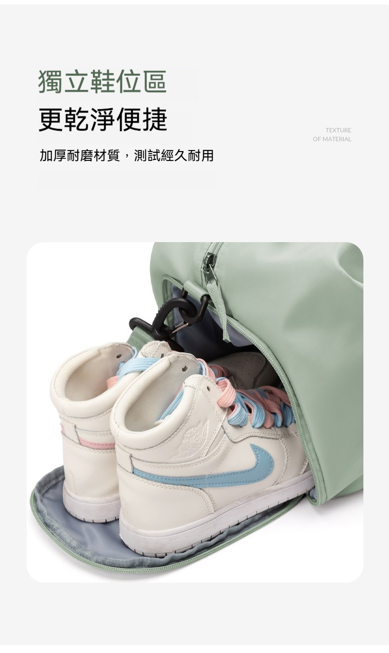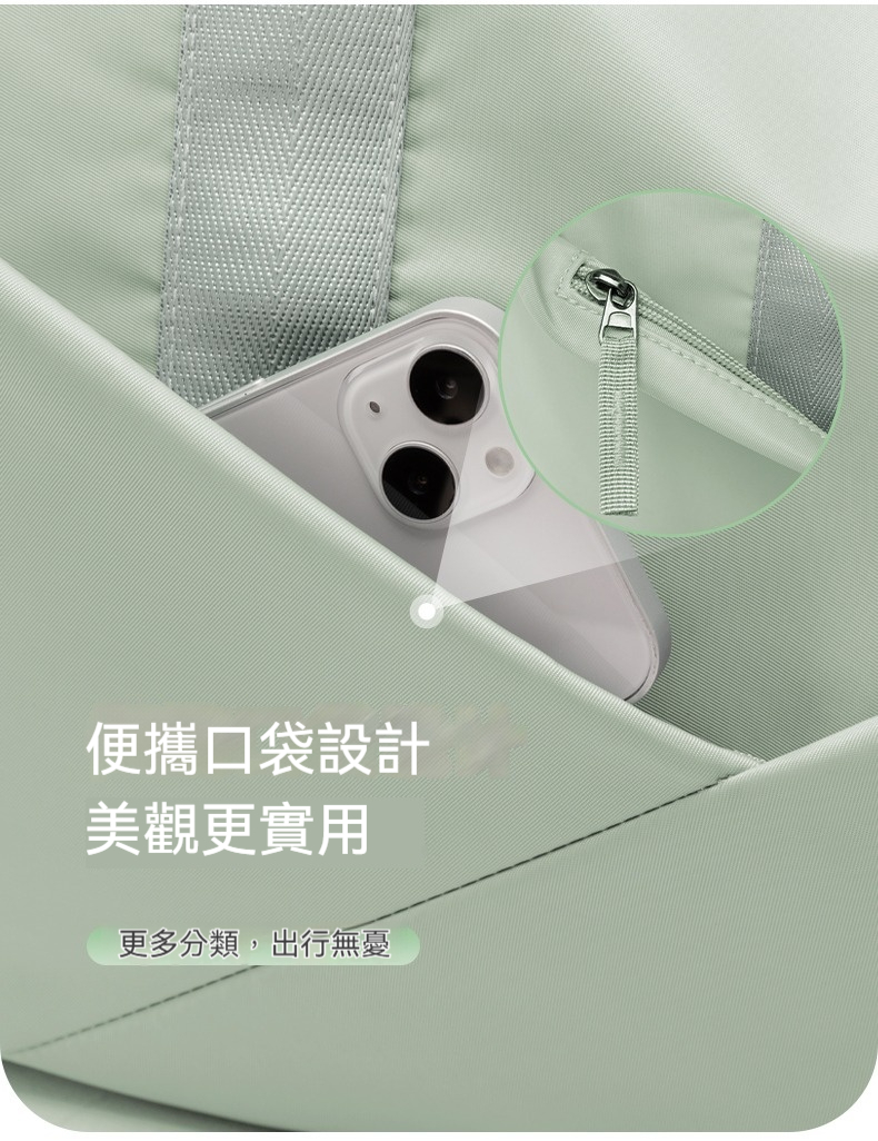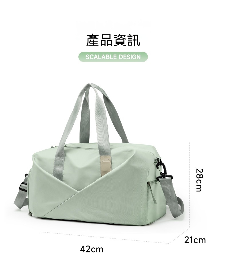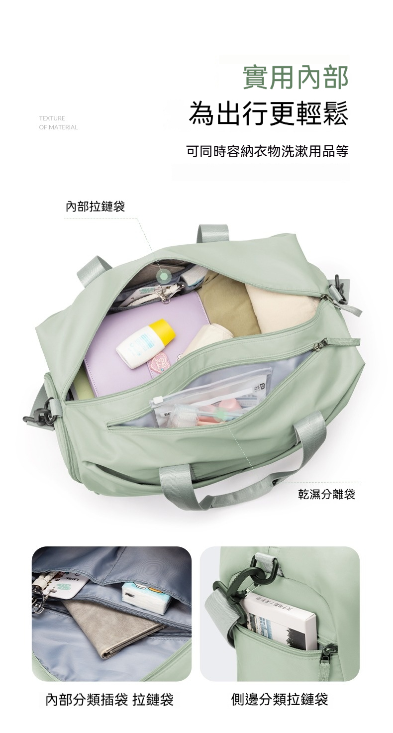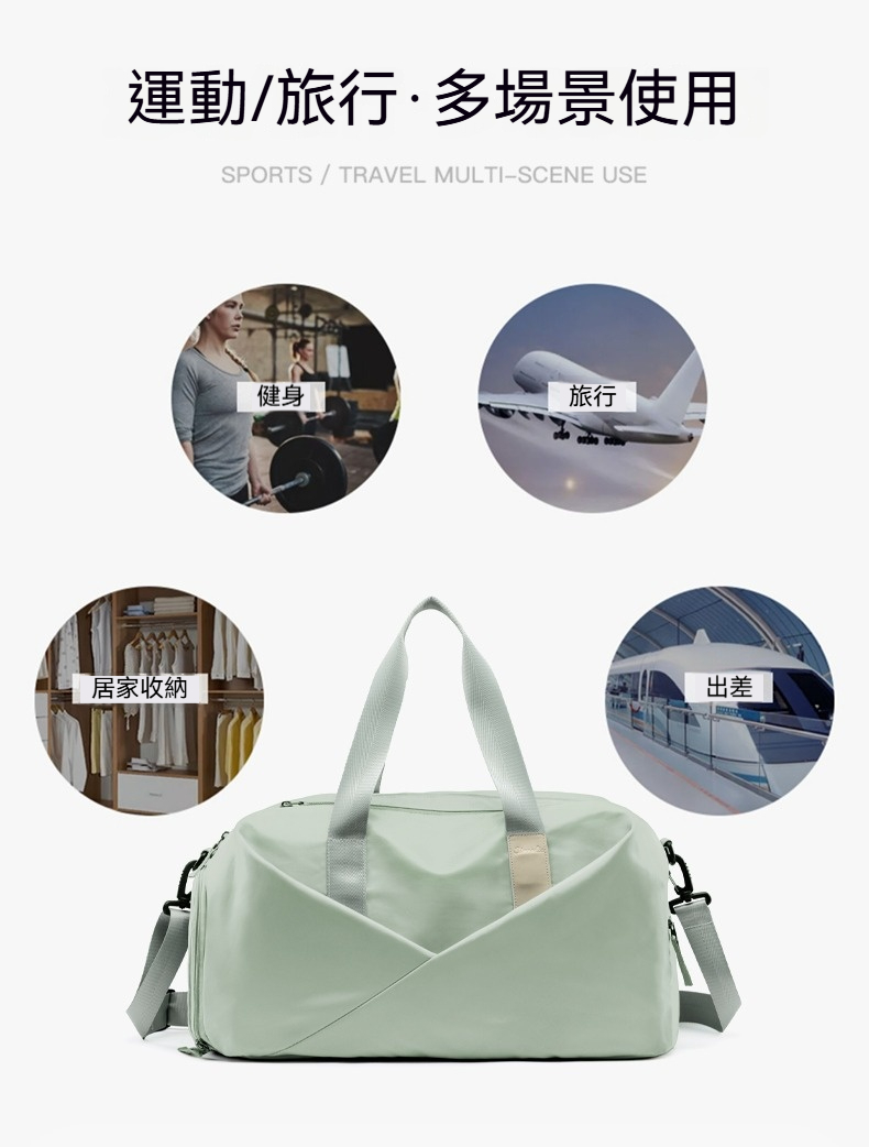 👜結構:主袋、內貼袋*2、拉鍊內貼袋、乾溼分離拉鍊袋、側邊拉鍊鞋倉、側邊拉鏈袋、前幅拉鍊貼袋