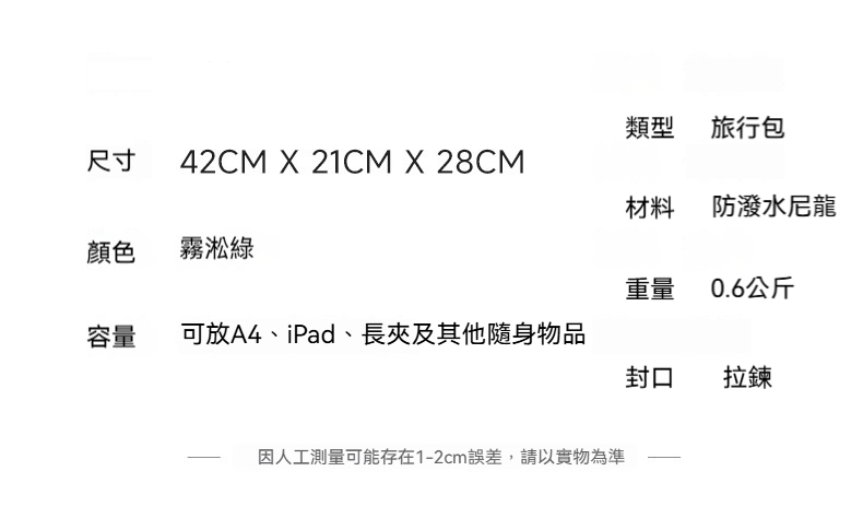 👜容量:可放A4、iPad、長夾及其他隨身物品