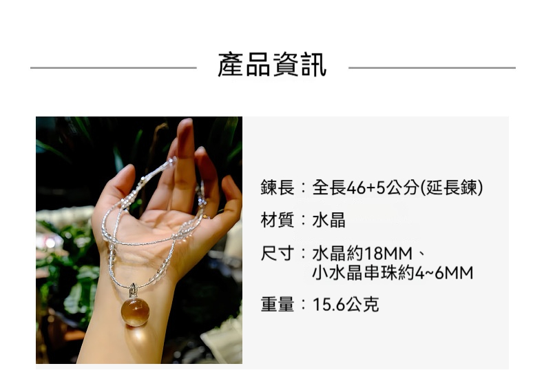 👜商品尺吋:全長46+5公分(延長鍊)、水晶約18MM、小水晶串珠約4~6MM ,無彈性