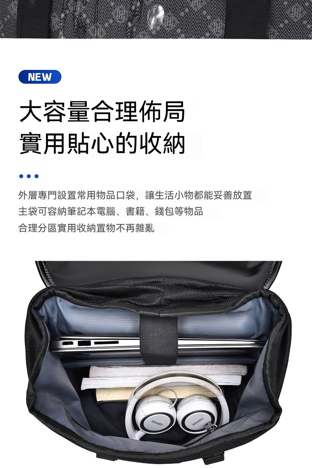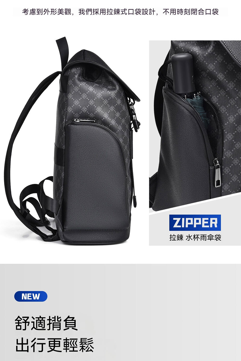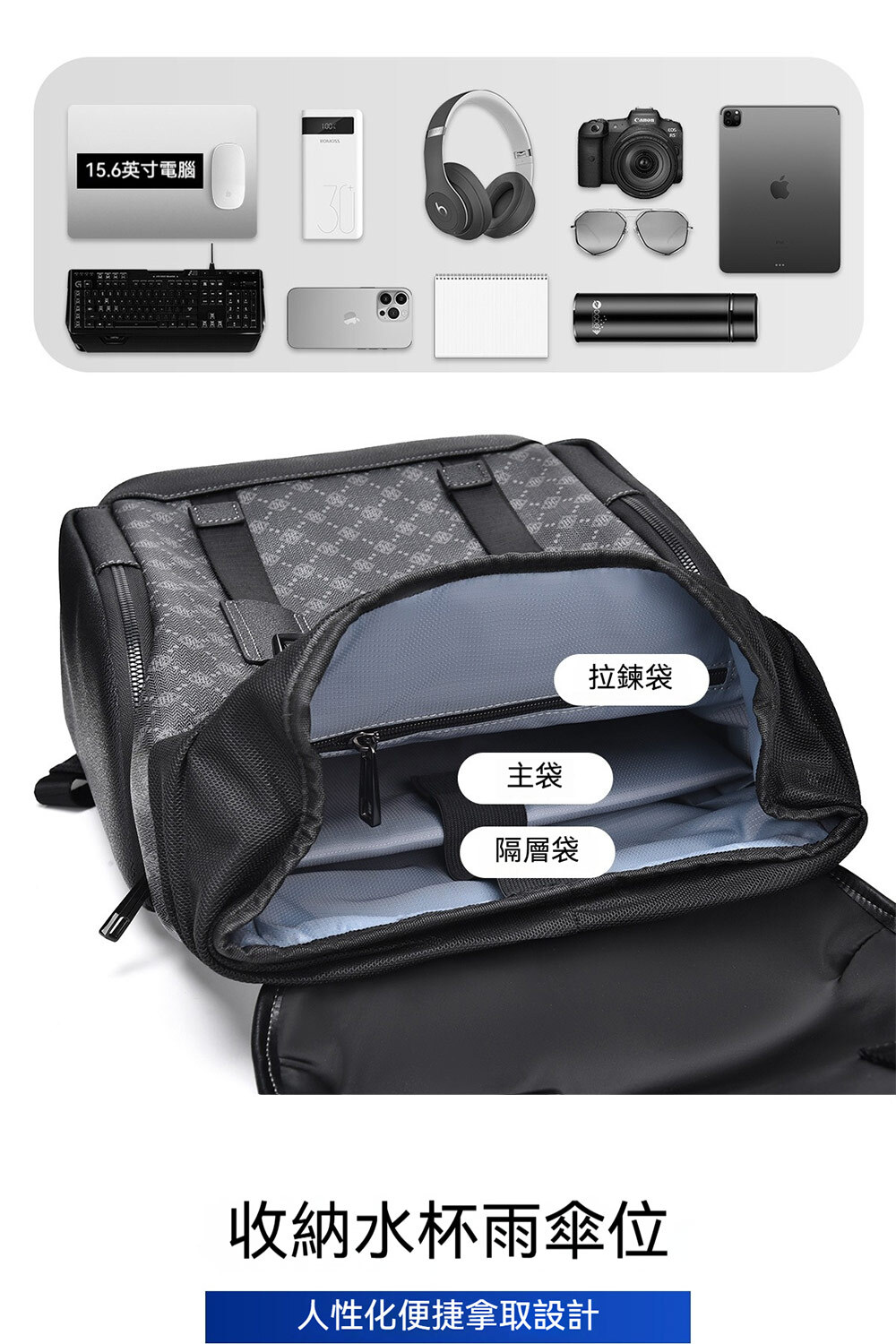 👜結構:拉鍊袋*1、主袋、電腦隔層袋*1、側袋*2