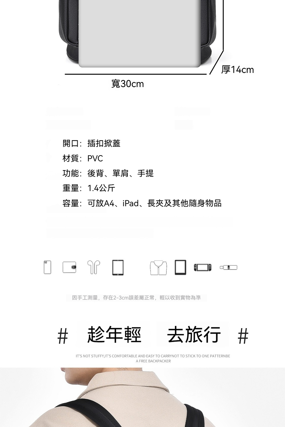 👜容量:可放A4、iPad、長夾及其他隨身物品