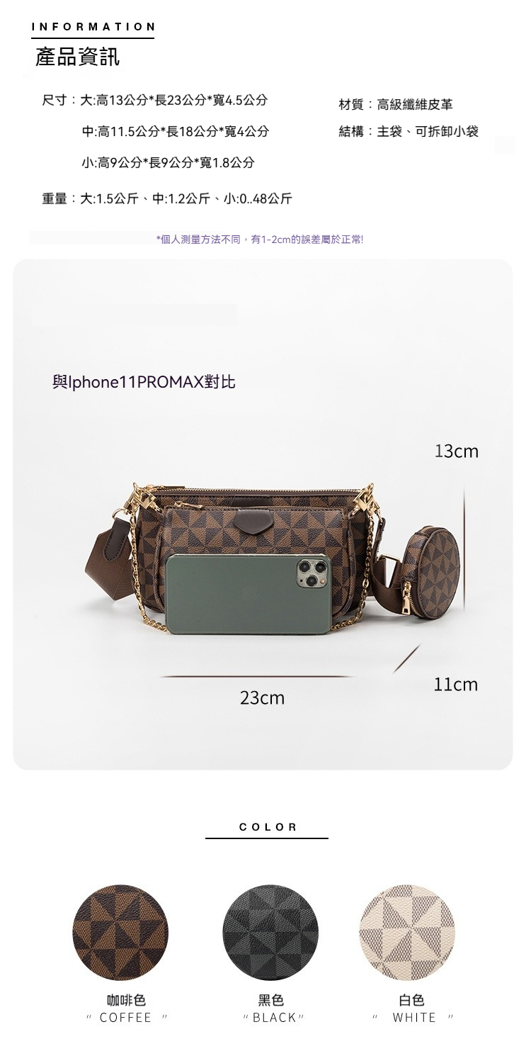 👜尺寸:大:高13公分*長23公分*寬4.5公分、中:高11.5公分*長18公分*寬4公分、小:高9公分*長9公分*寬1.8公分