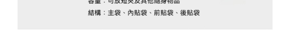 👜結構:主袋、內貼袋、前貼袋、後貼袋