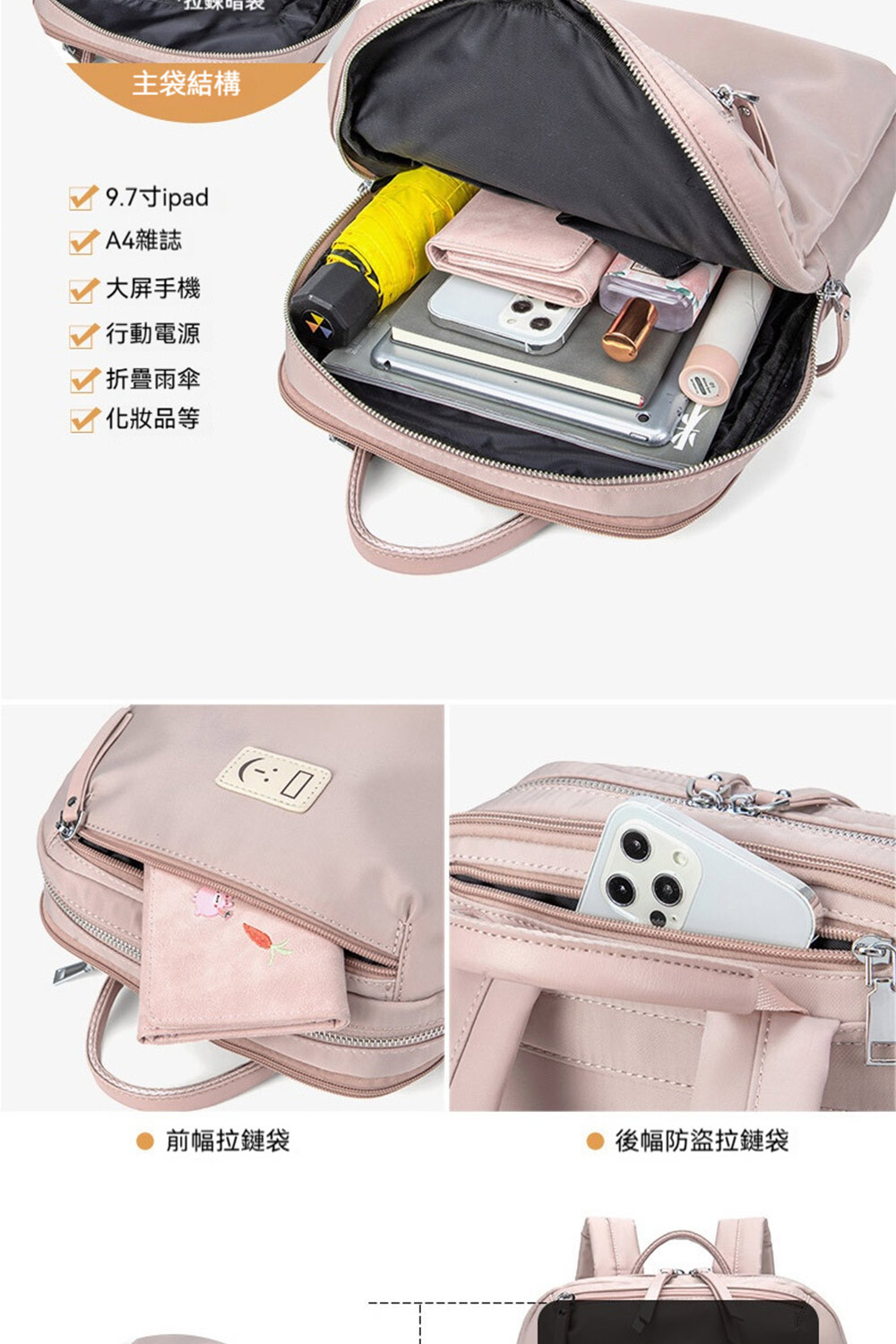 👜結構:主袋、內貼袋*2、拉鍊內貼袋、副袋、前拉鍊袋、後拉鍊袋