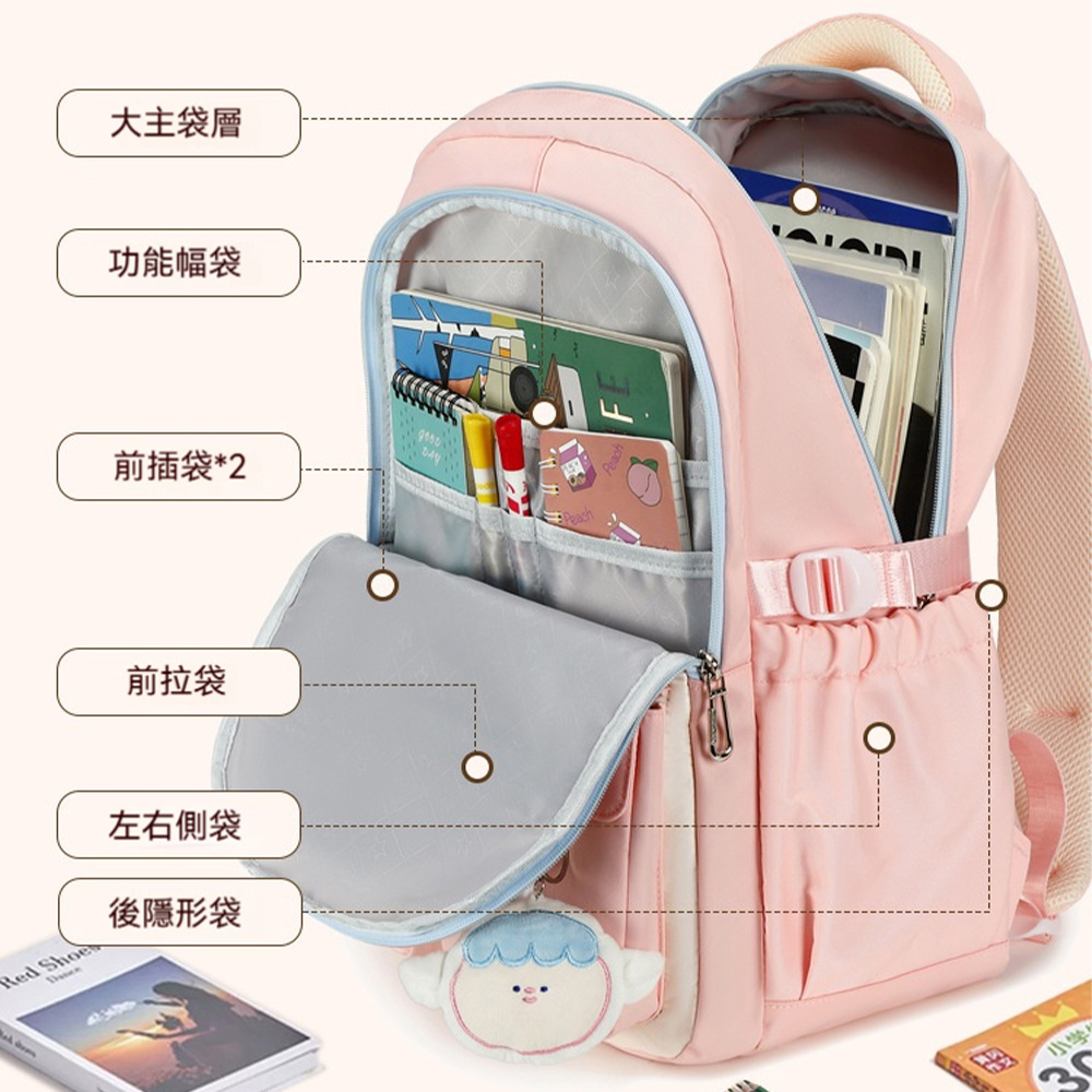 👜結構:主袋、筆電保護層、副袋、內貼袋*3、筆插*2、前置拉鍊袋*2、前置叉扣袋、兩側插袋、後幅拉鍊貼袋、行李桿插帶