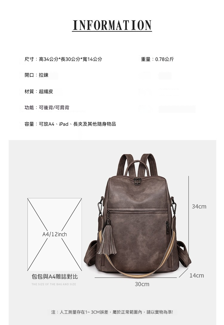 👜容量:可放A4、iPad、長夾及其他隨身物品