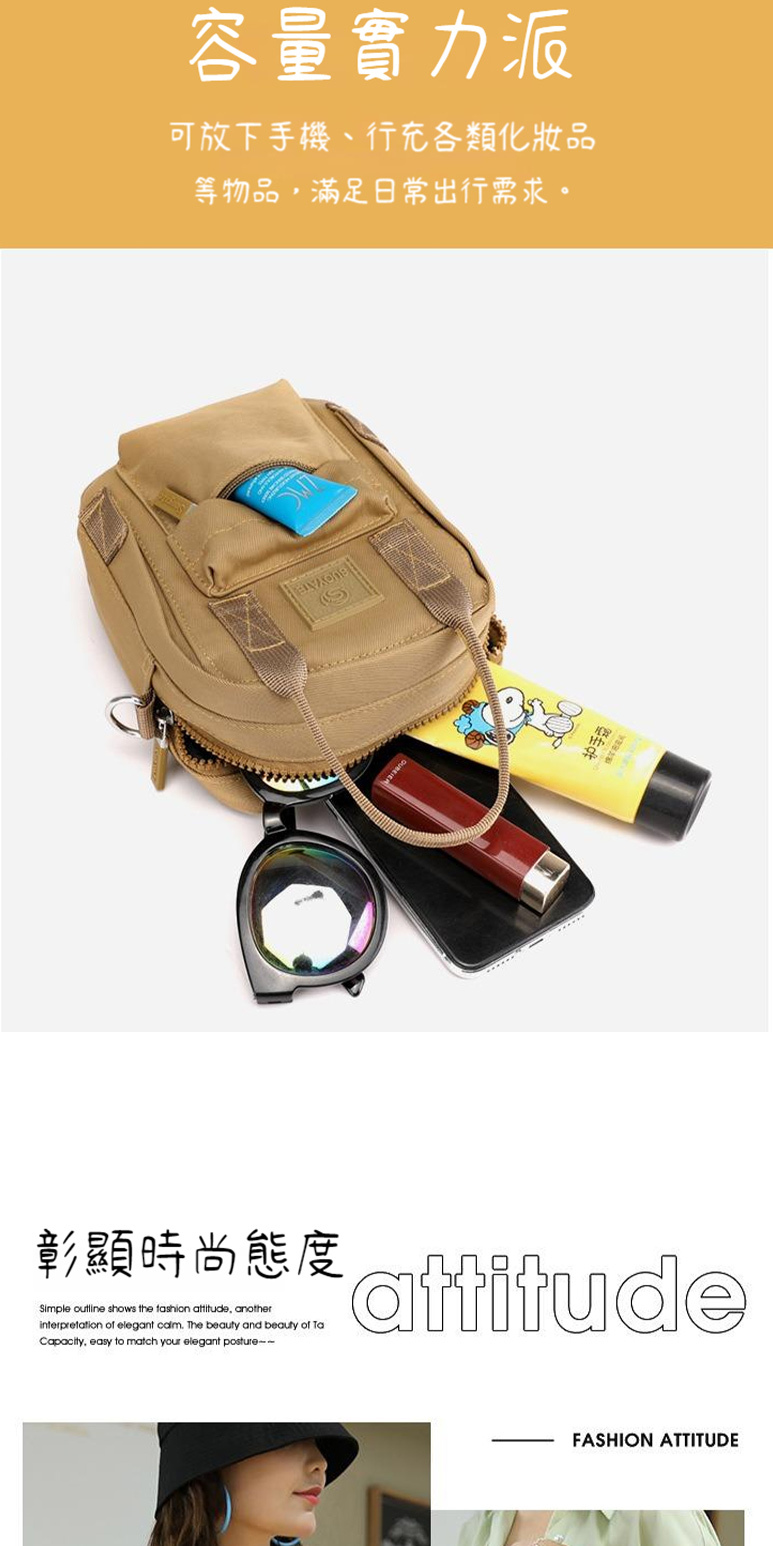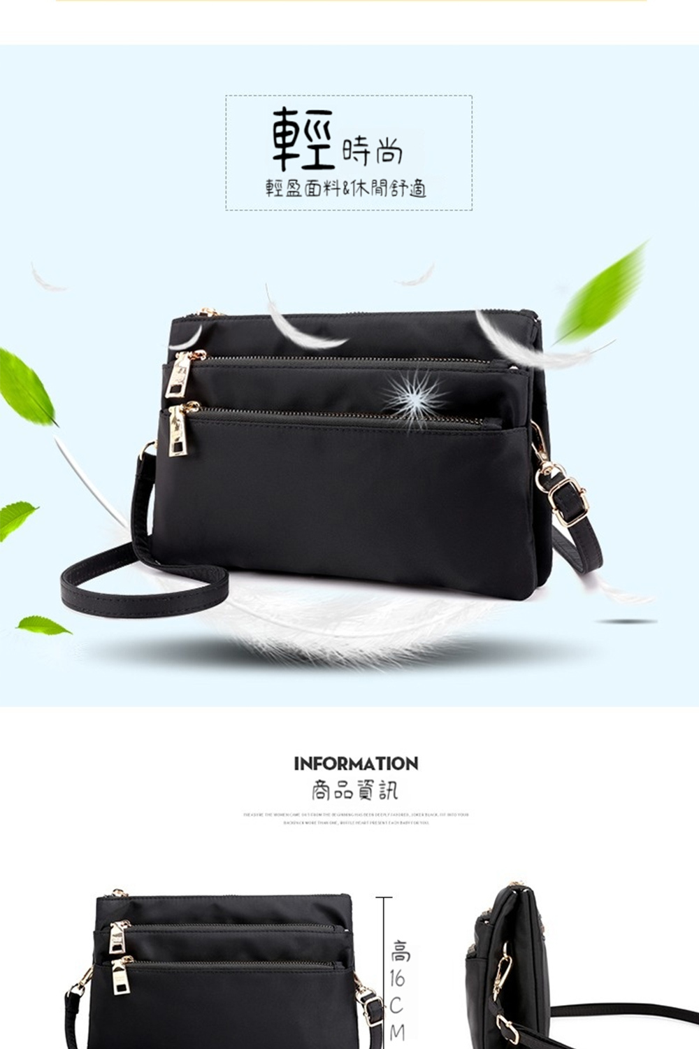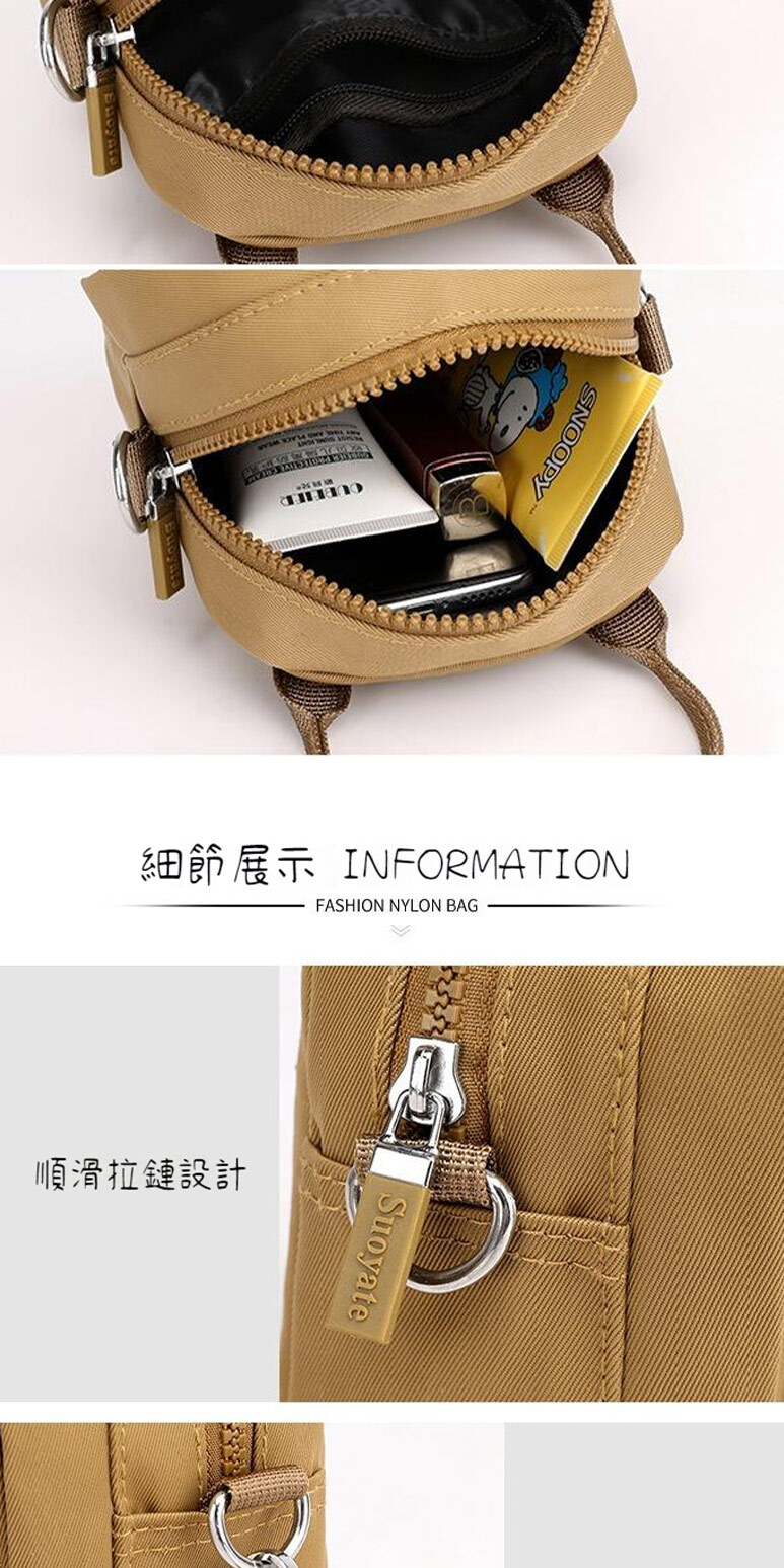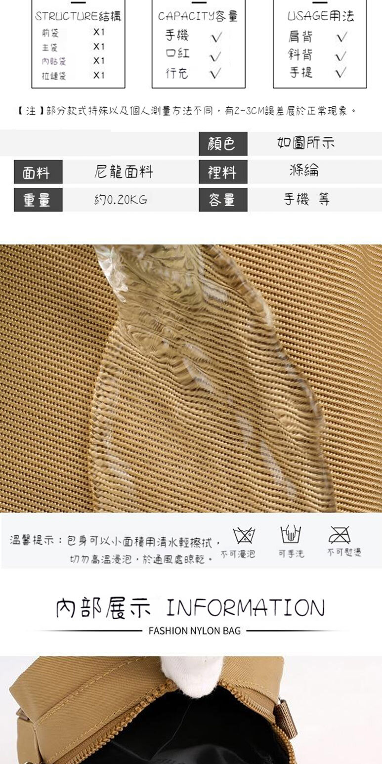 結構:主袋、拉鍊內貼袋、拉鍊口袋