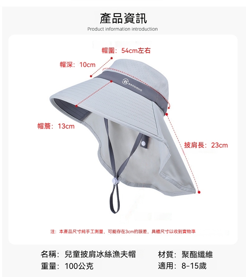 👜商品尺吋:帽圍約54公分,帽深10公分,帽簷13公分,披肩長約23公分(適用8-15歲)