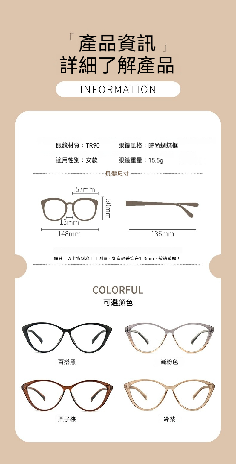 👜商品尺吋:總鏡寬14.8cm,鏡高5cm,單鏡寬5.7cm,鼻間距13mm,鏡腿長13.6cm