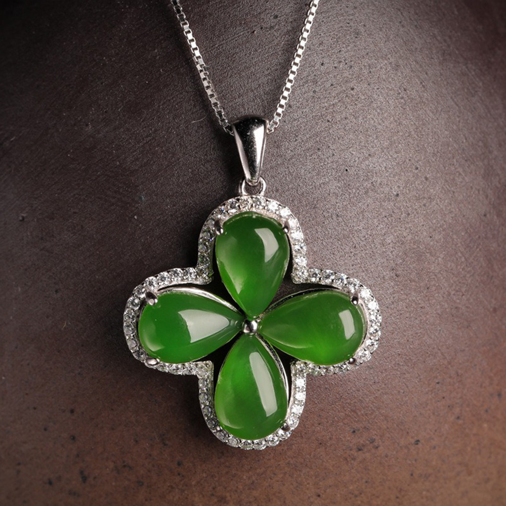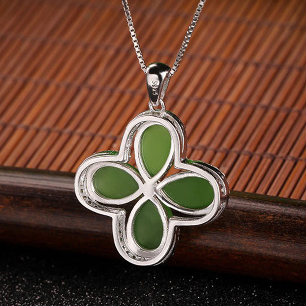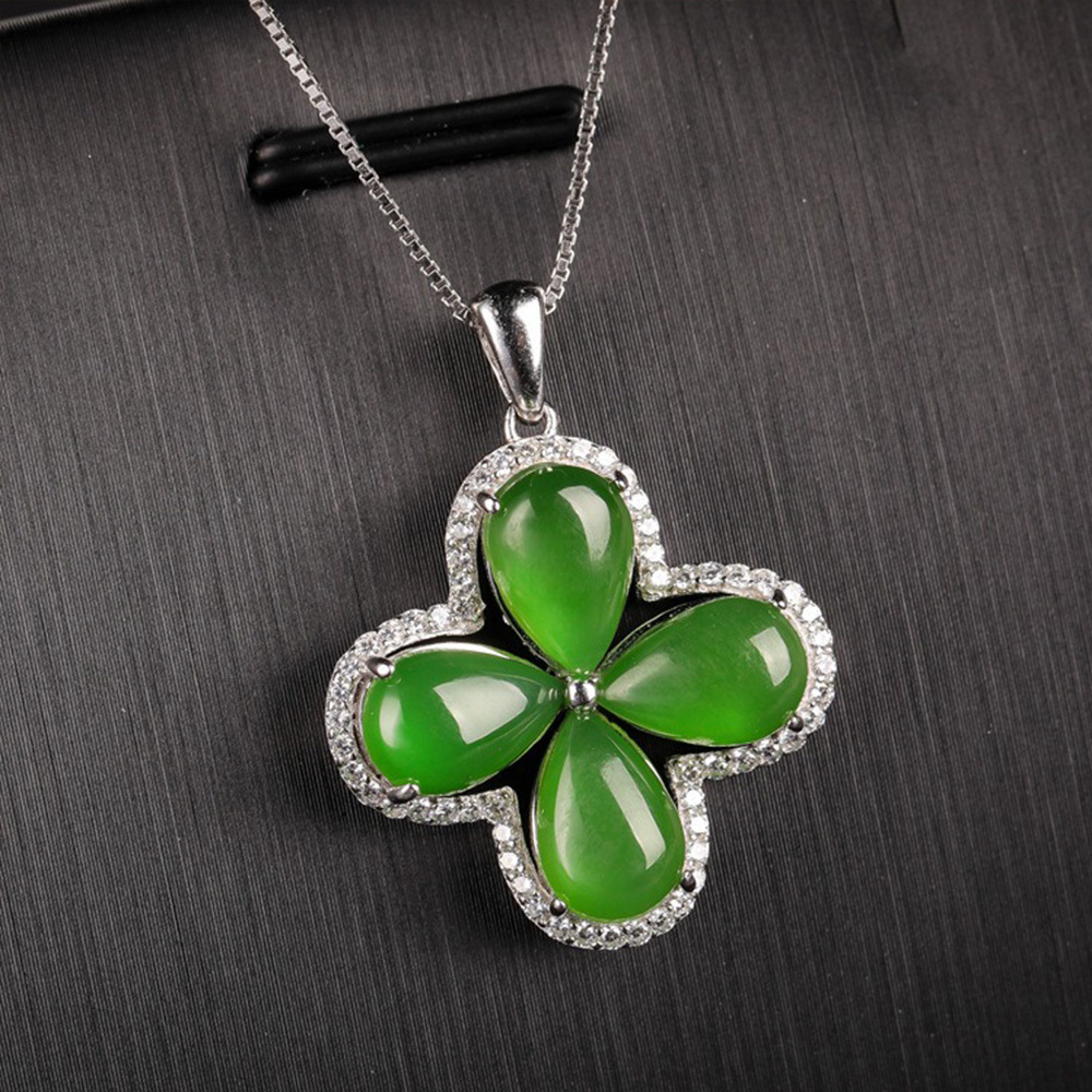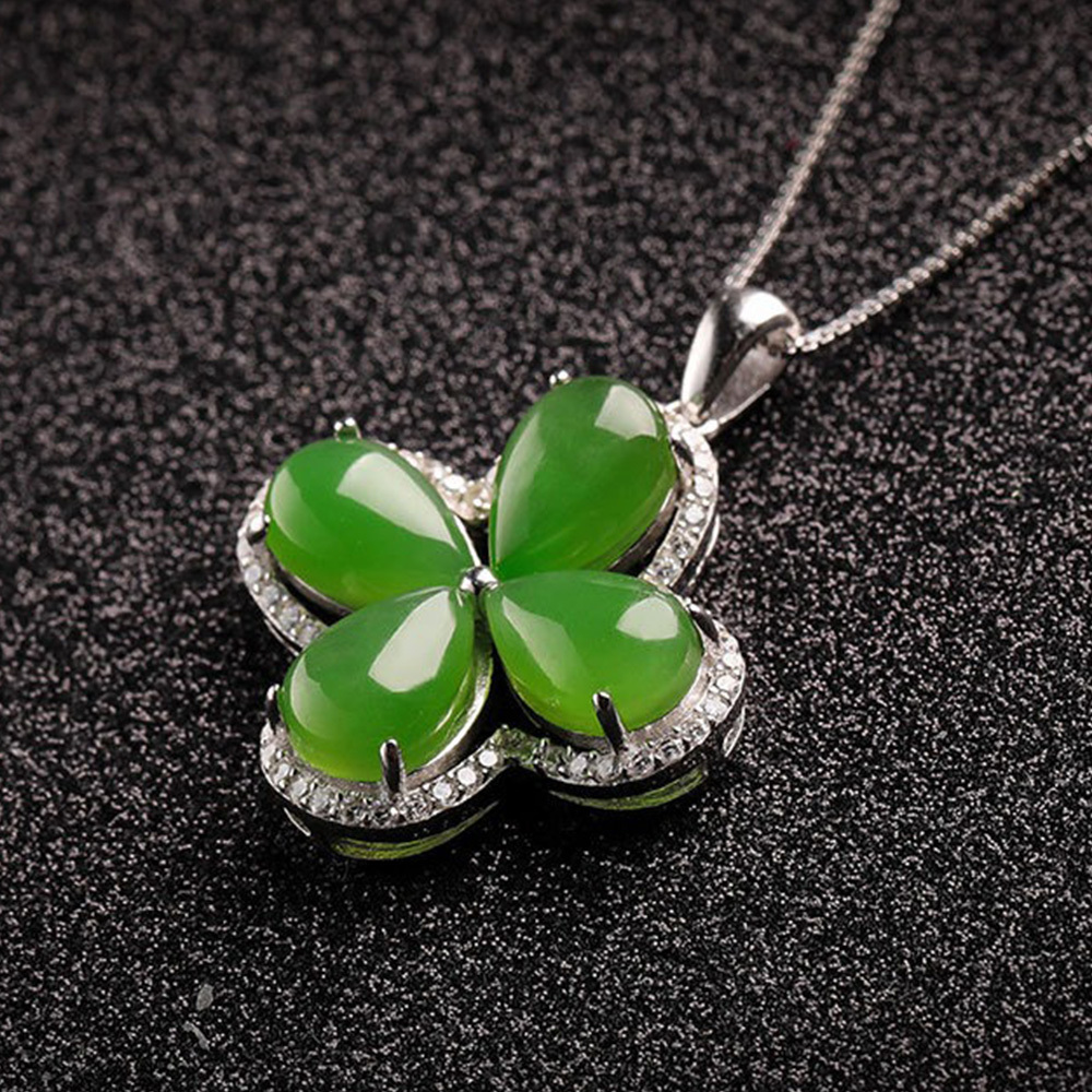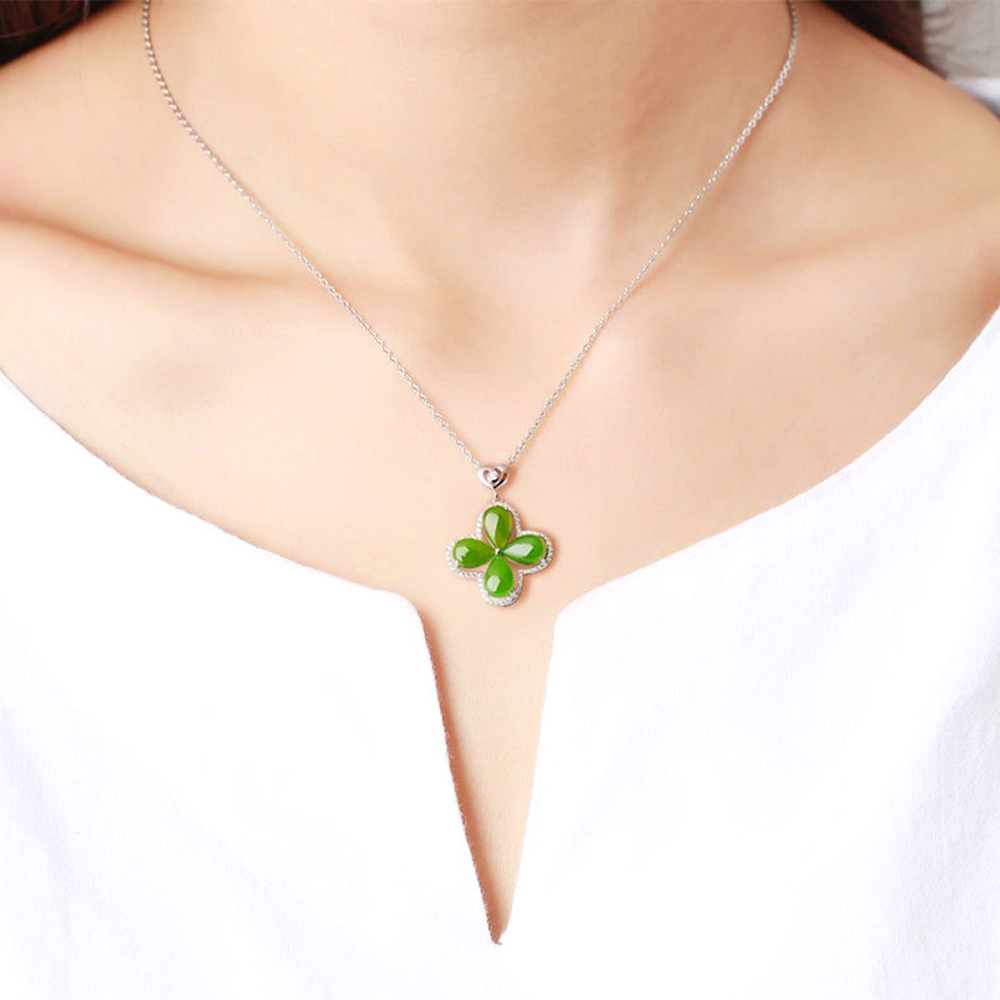 四葉草項鏈 碧玉吊墜項鍊 天然玉石 925銀鎖骨鏈 女生鎖骨鏈 和田玉飾品 配飾 698