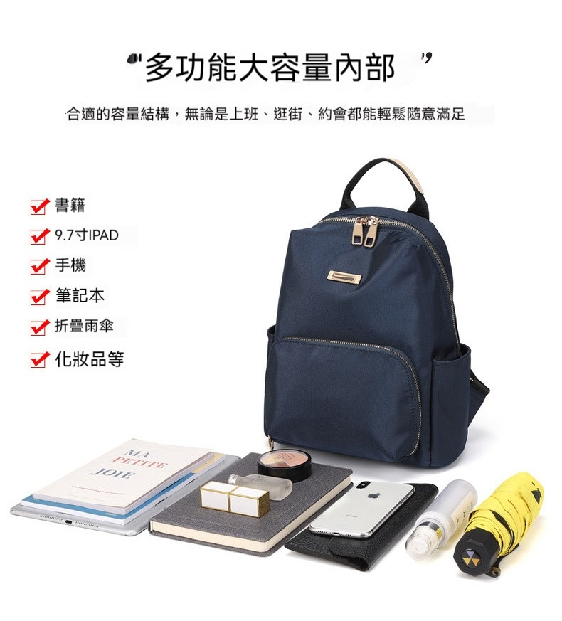 👜結構:拉鍊主袋、內貼袋*2、拉鍊內貼袋、前幅拉鍊袋、後幅防盜拉鍊貼袋
