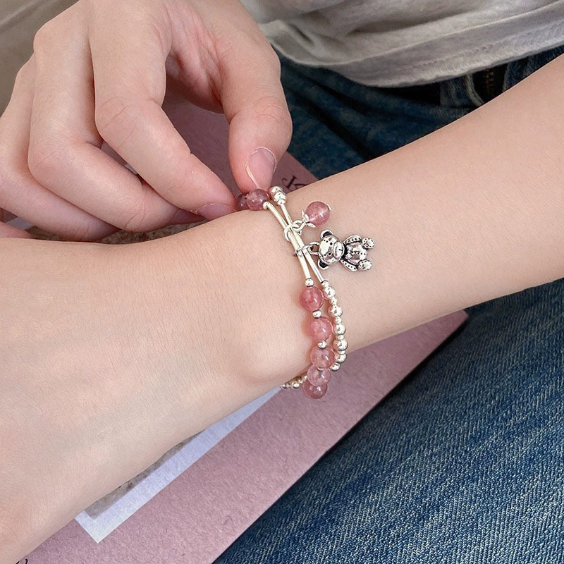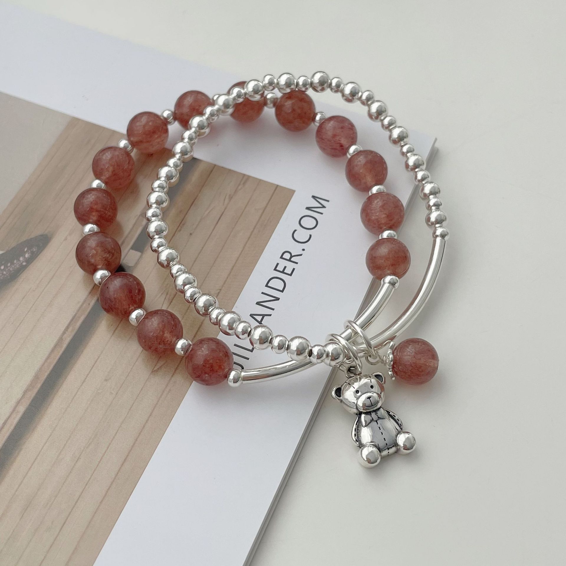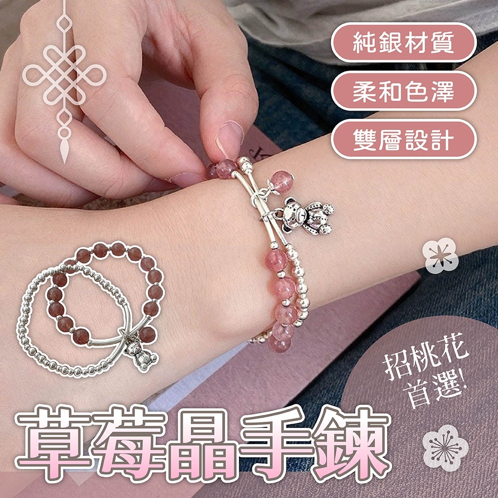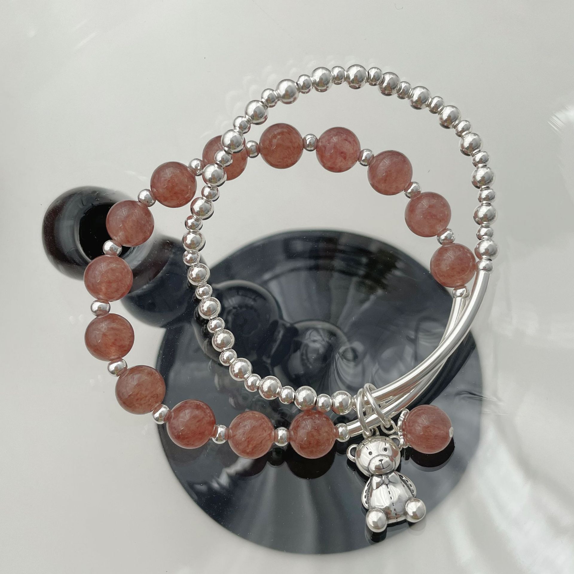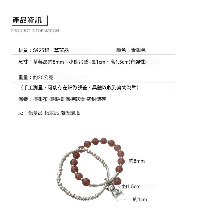 ✨ 商品尺吋:草莓晶約8mm、小熊吊墜-長1cm、高1.5cm(有彈性) 、建議手圍15~16cm