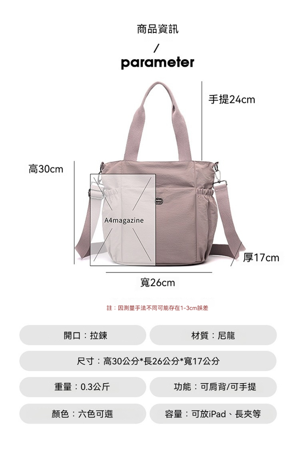 👜結構:主袋、內貼袋*2、拉鍊內貼袋、側袋*2、前袋、後拉鍊袋