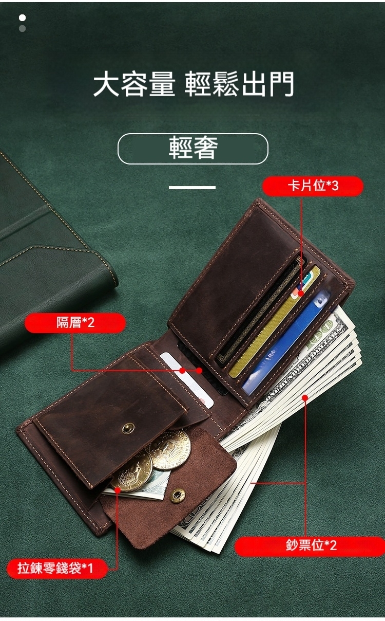 👜 結構:鈔票位*2、隔層*2、卡片位*3、拉鍊零錢袋*1
