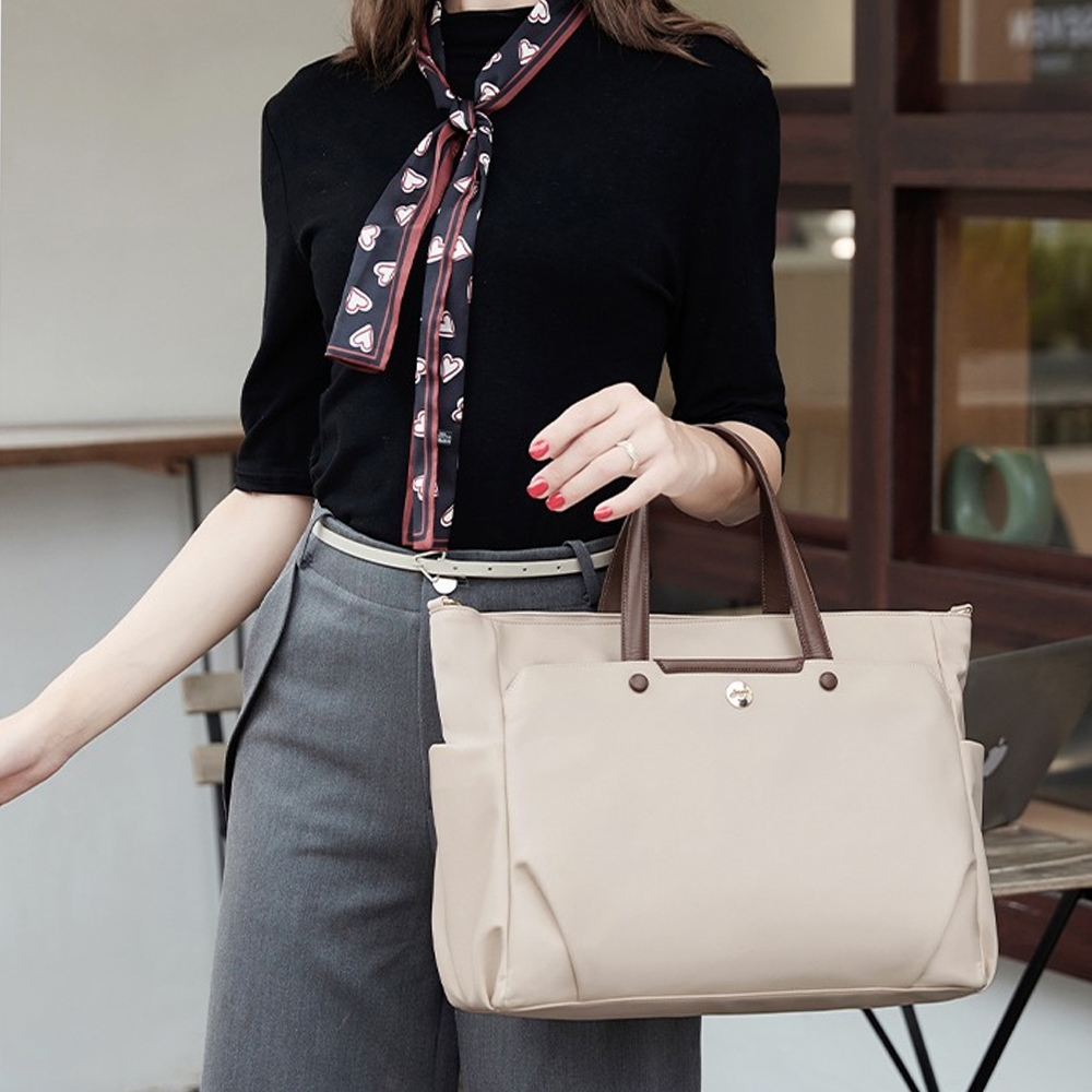 👜結構:主袋、內貼袋*2、拉鍊內貼袋、緩衝隔層、前幅拉鍊袋、後貼拉鍊防盜袋、兩側插袋