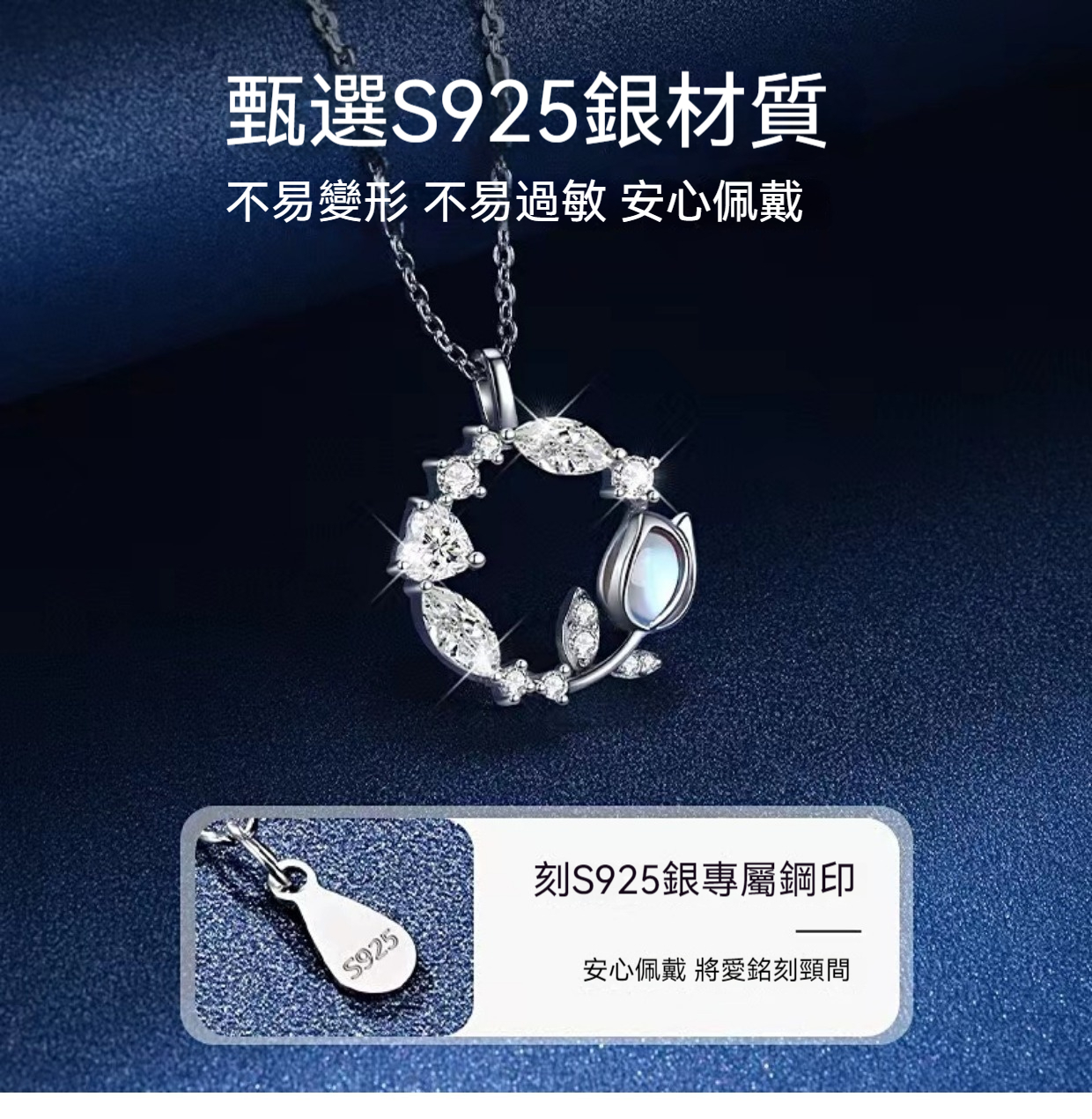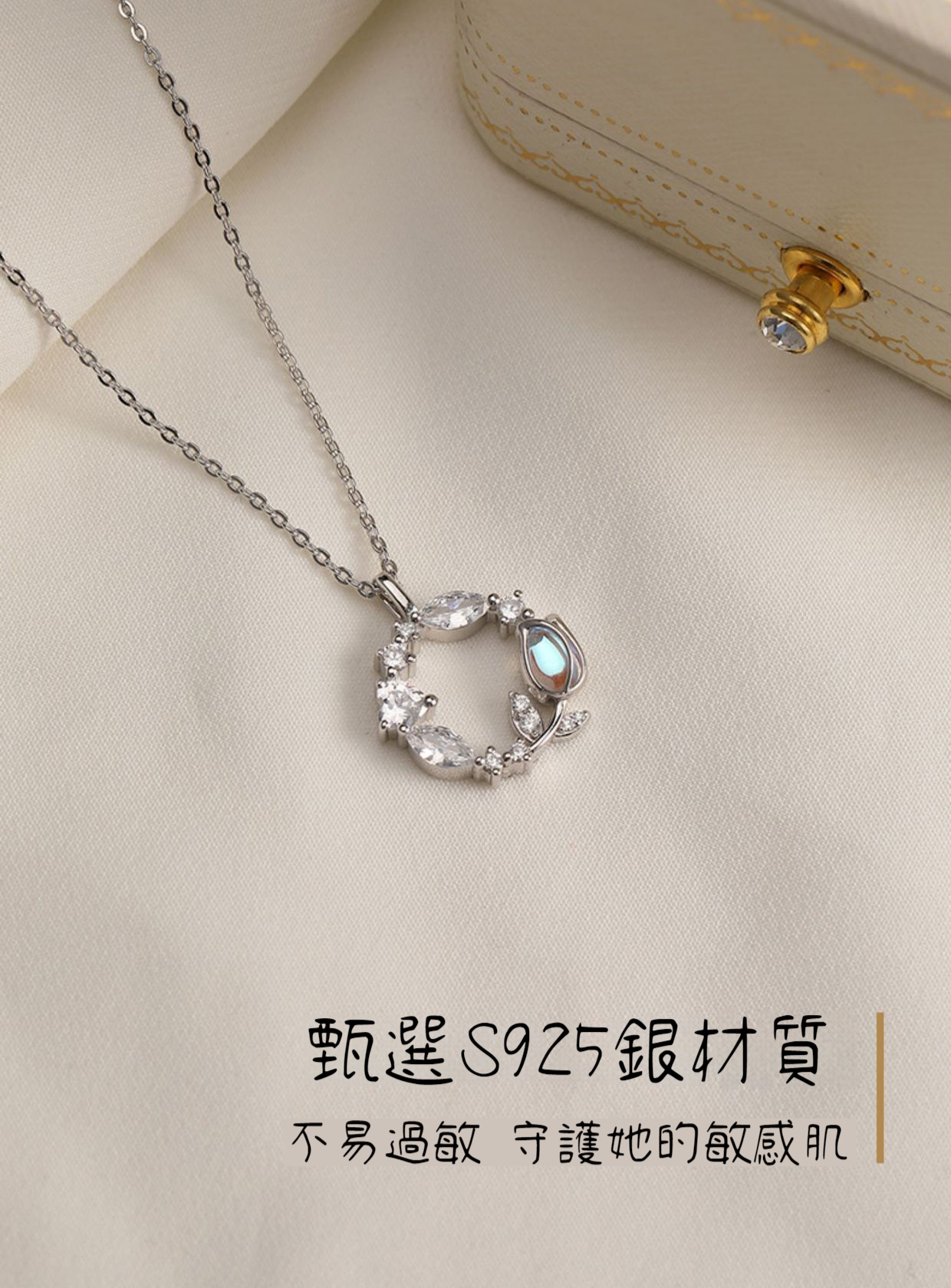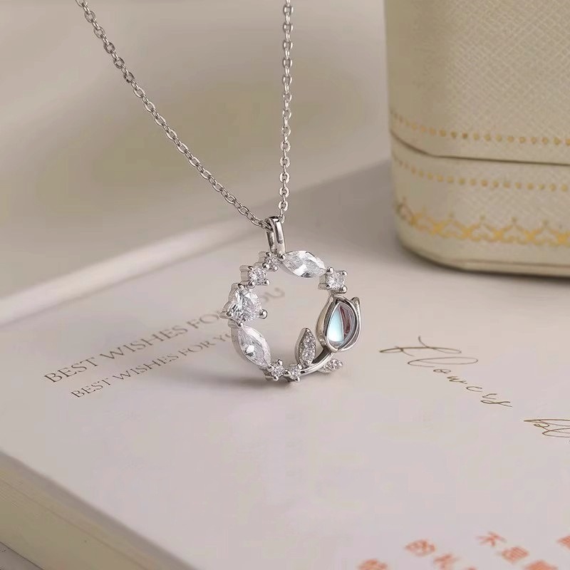 項鍊 銀項鍊 月光石項鍊 S925 純銀項鍊 鬱金香項鍊 花環項鍊 氣質項鍊 守護愛情 鎖骨鍊 銀飾品 女生禮物 270
