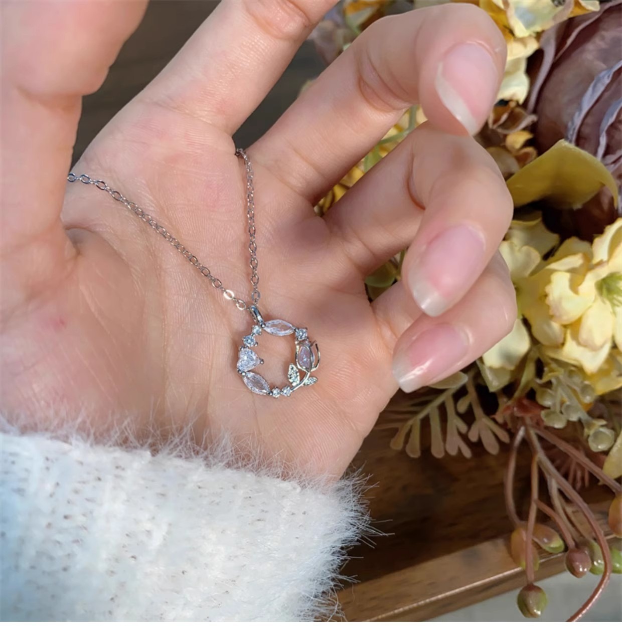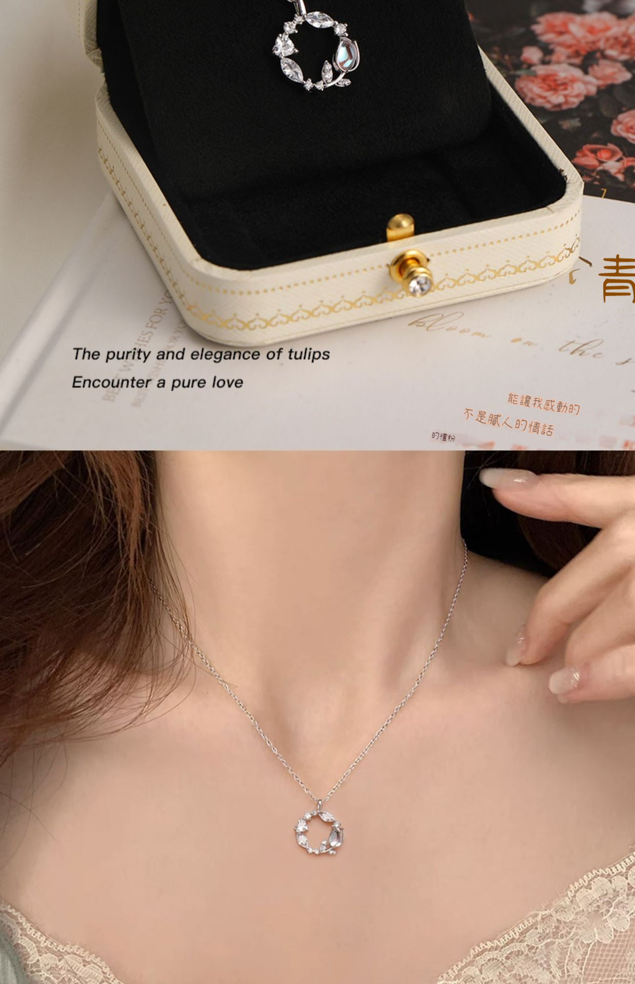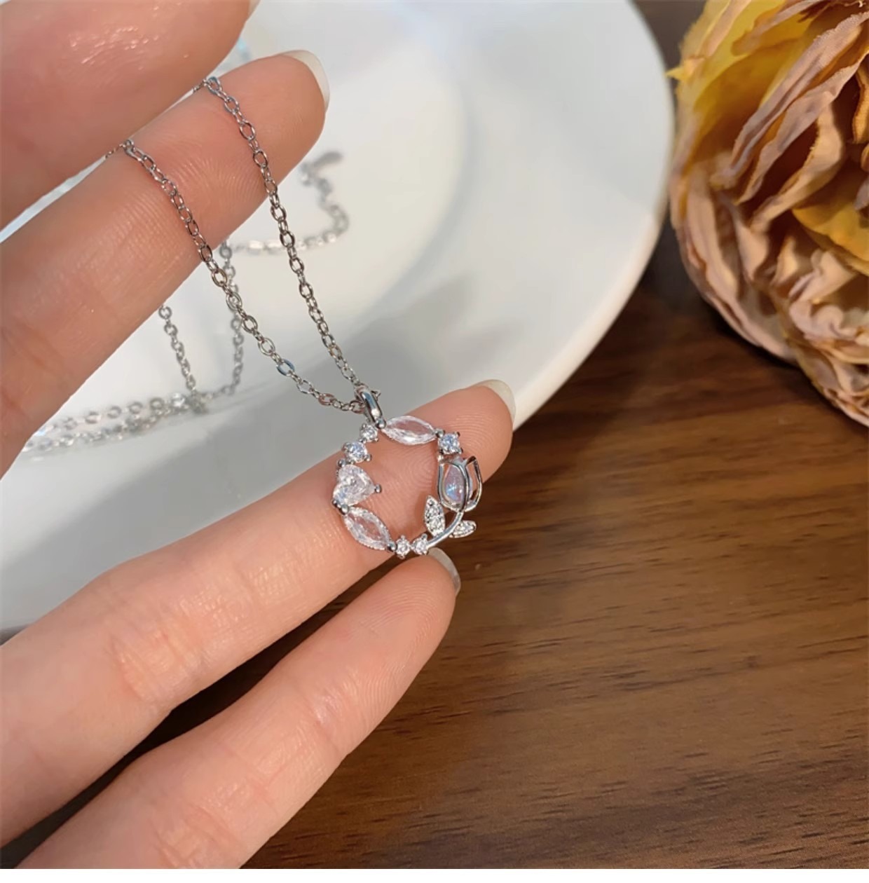 項鍊 銀項鍊 月光石項鍊 S925 純銀項鍊 鬱金香項鍊 花環項鍊 氣質項鍊 守護愛情 鎖骨鍊 銀飾品 女生禮物 270