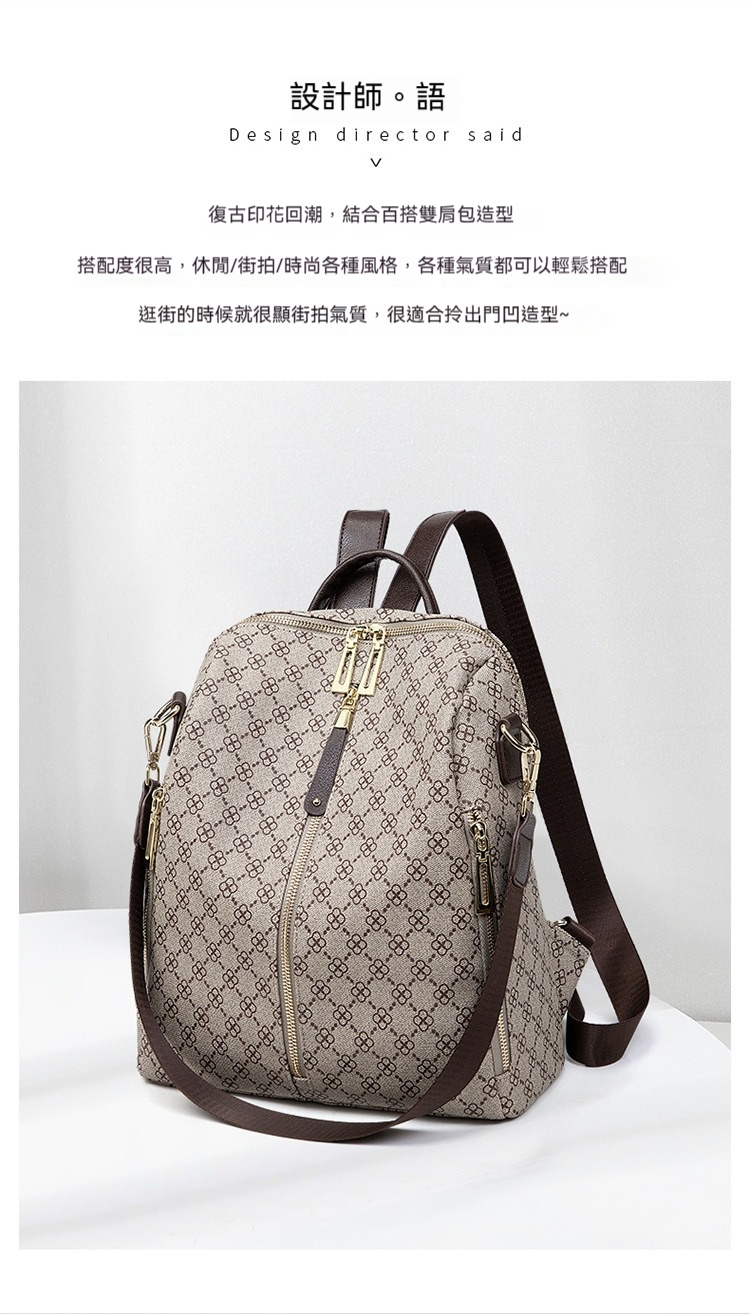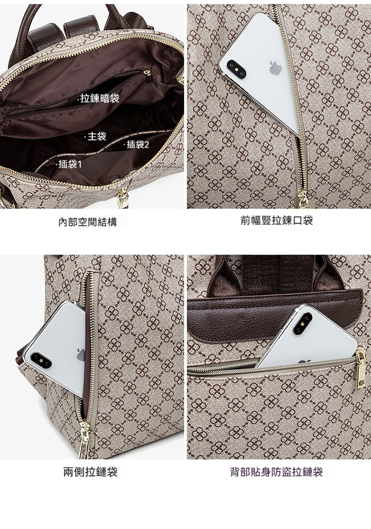 👜結構:主袋、內貼袋*2、拉鍊內貼袋、後防盜拉鍊袋、前拉鍊袋*3