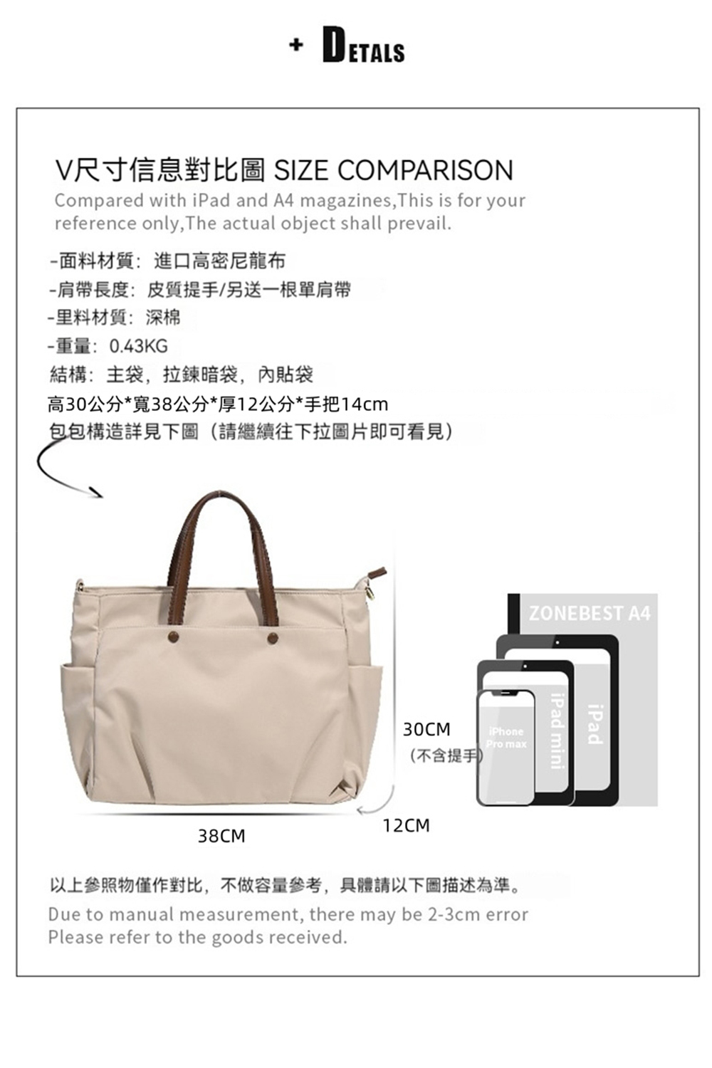 👜容量:可放A4、長夾、15寸平板電腦及其他隨身物品