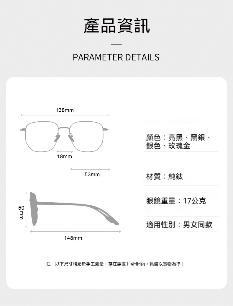 👜商品尺吋:總鏡寬13.8cm,單鏡寬5.3cm,鏡高5cm,鼻間寬18mm,鏡腿長14.8cm