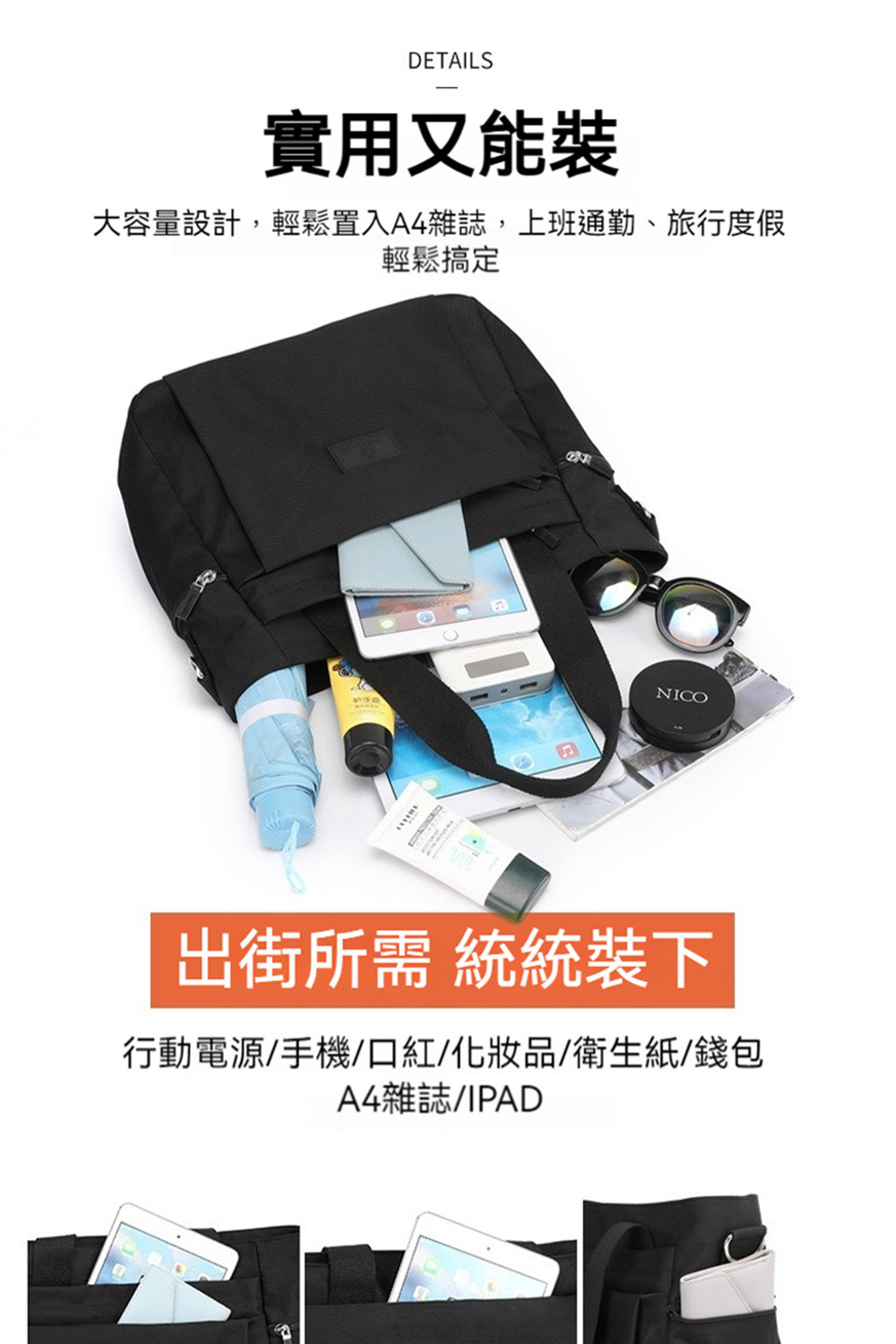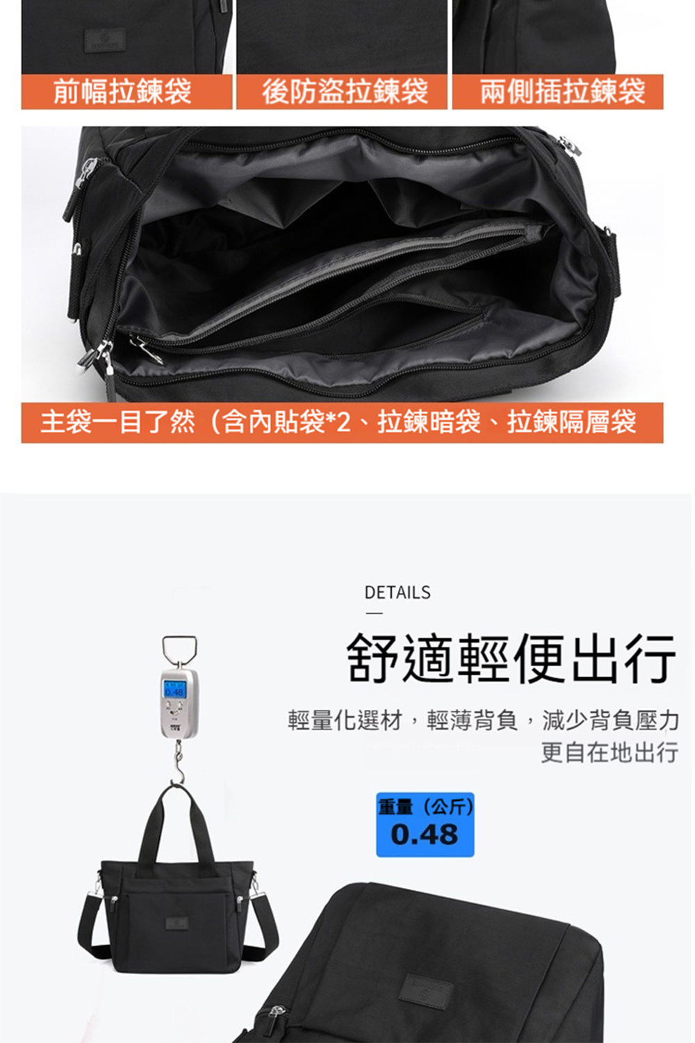 👜結構:主袋、拉鍊隔層袋、內貼袋*2、拉鍊內貼袋、前幅拉鍊袋*2、後防盜拉鍊袋、兩側插拉鍊袋