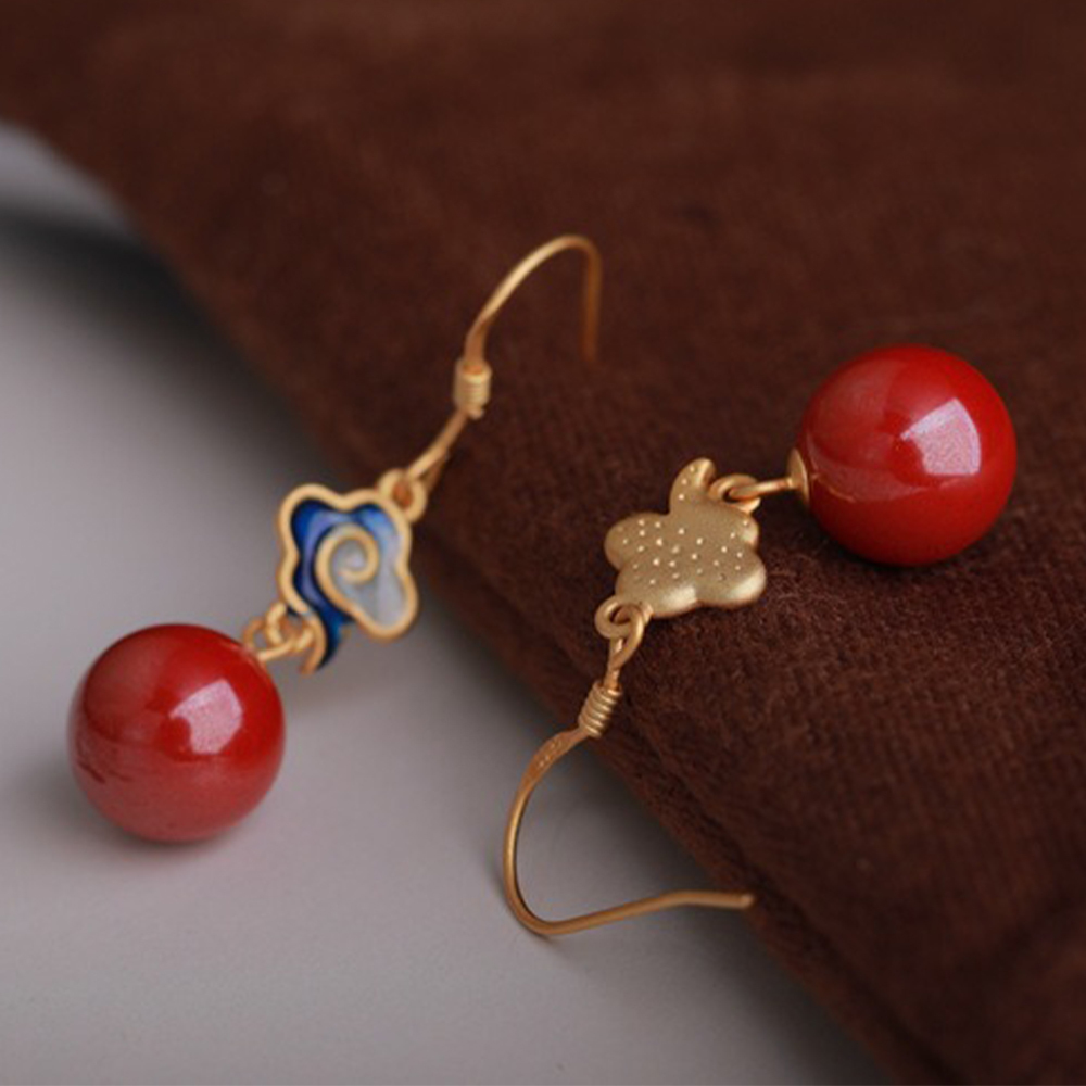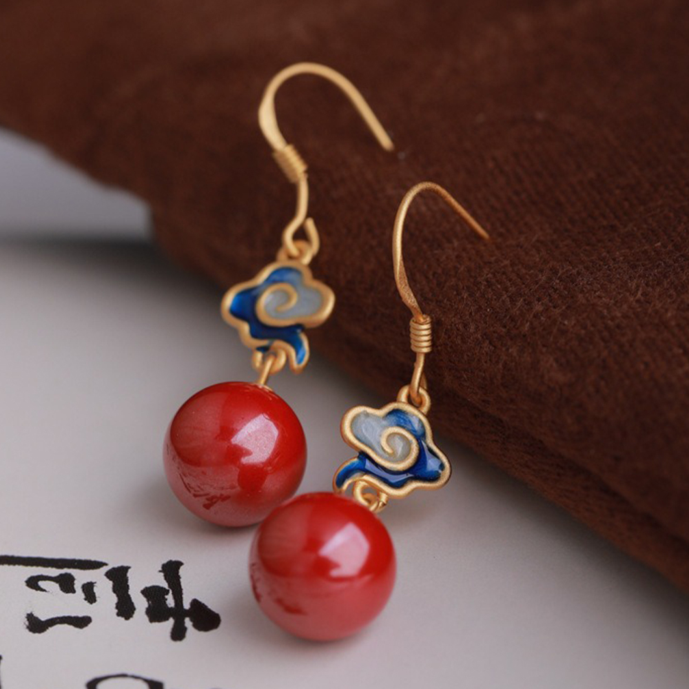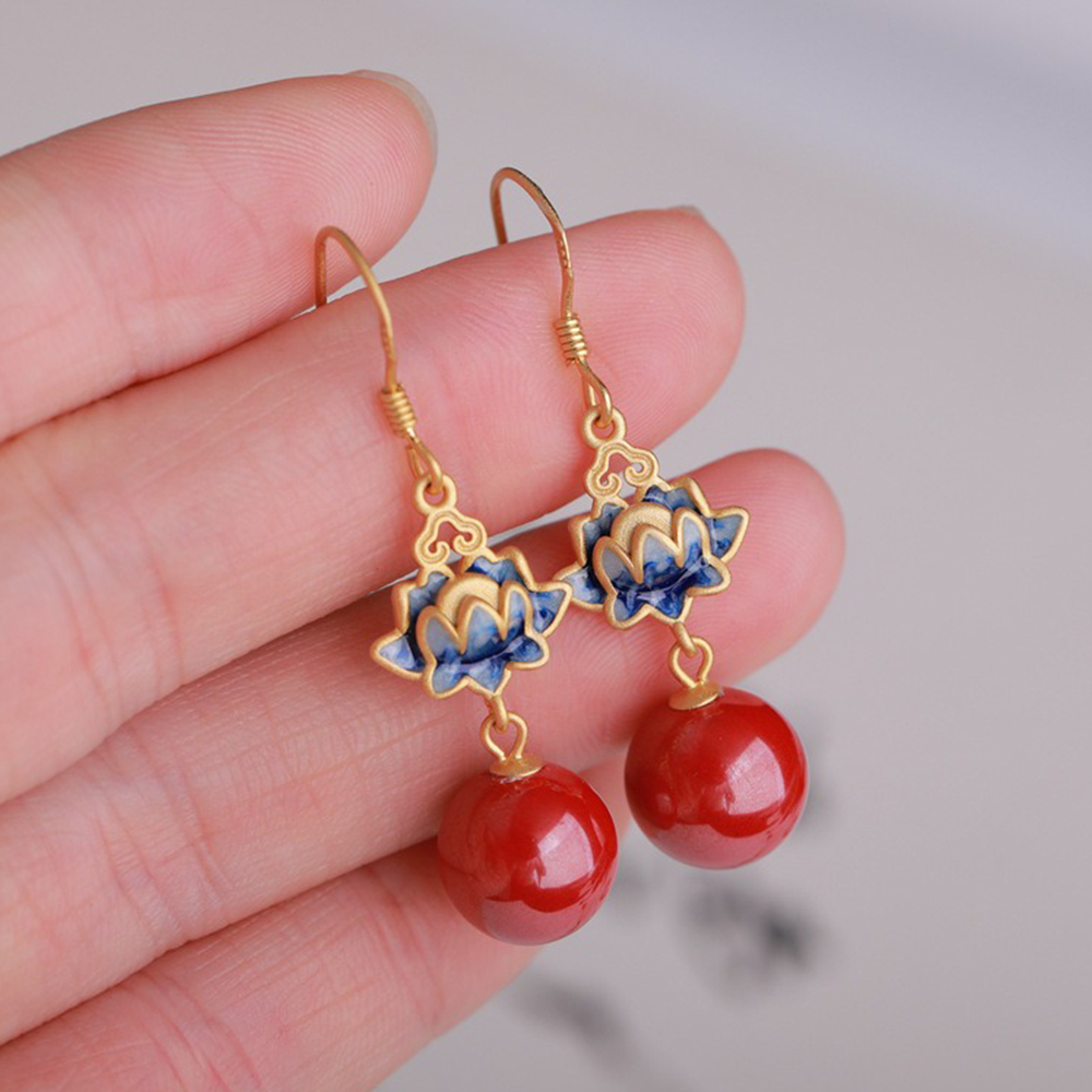 飾品 耳環 女生耳環 朱砂耳環 純銀耳環 S925 宮廷風 新中式 蓮花耳環 大圓耳環 復古風 抗過敏 耳飾 耳釘532