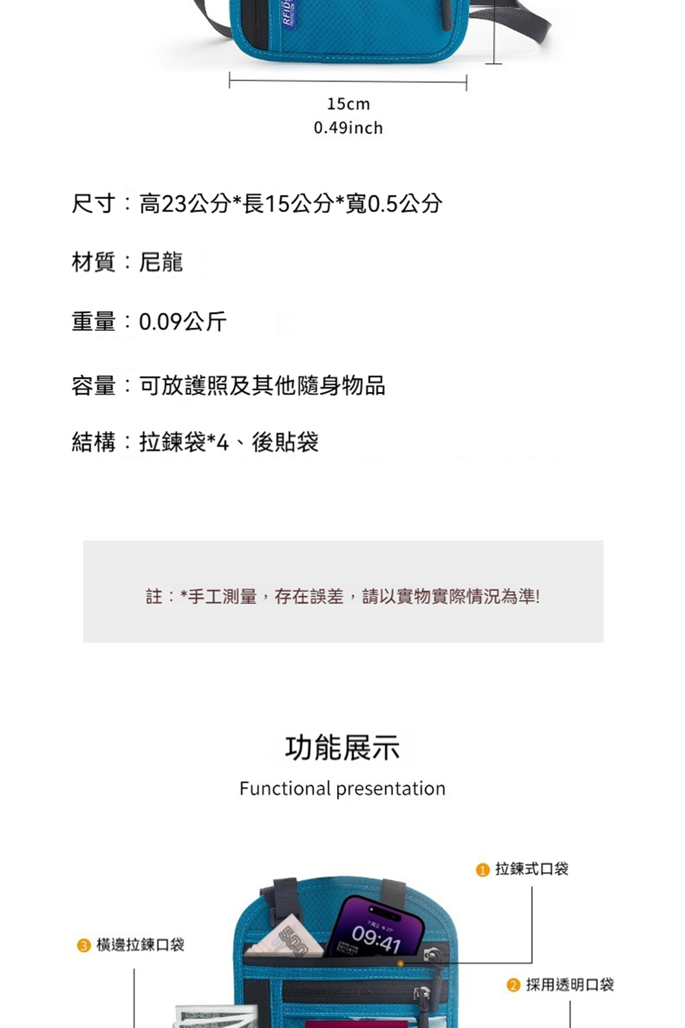 👜容量:可放護照及其他隨身物品