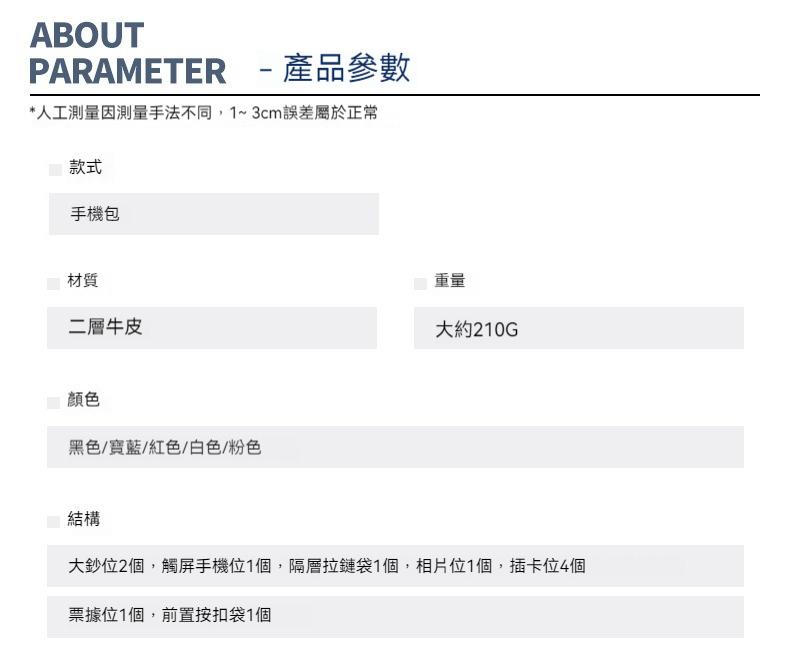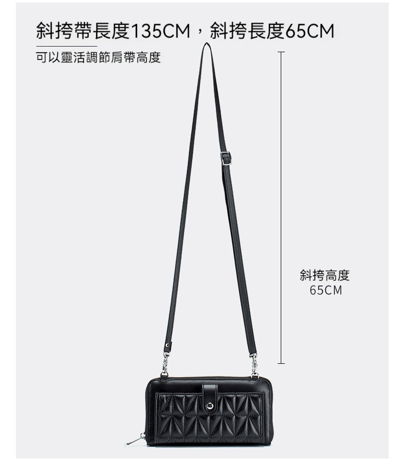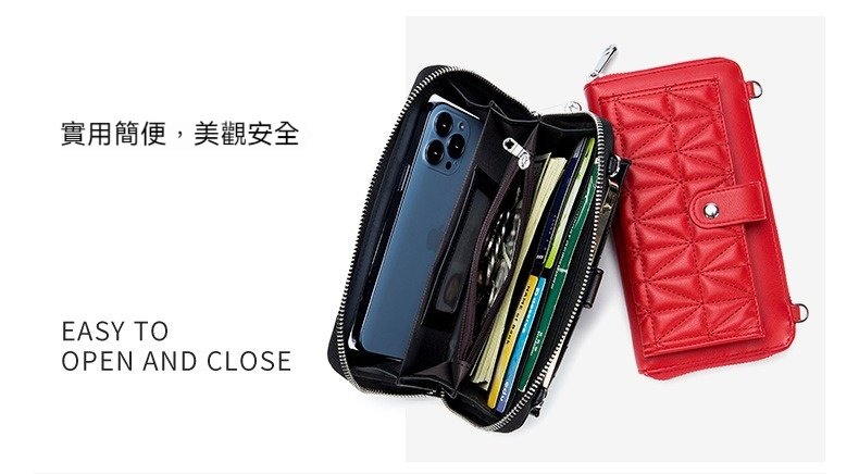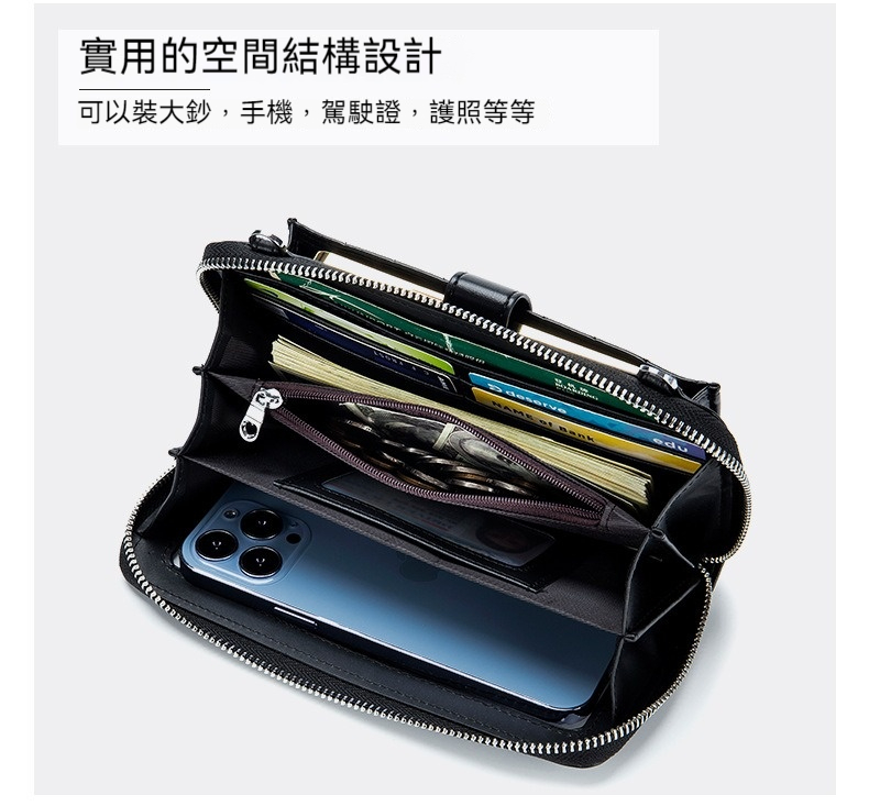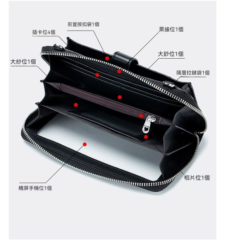 👜容量 / 結構:觸控層、相片位、鈔票層*2、卡片位*4、暗層、拉鍊零錢位、外幅壓扣袋