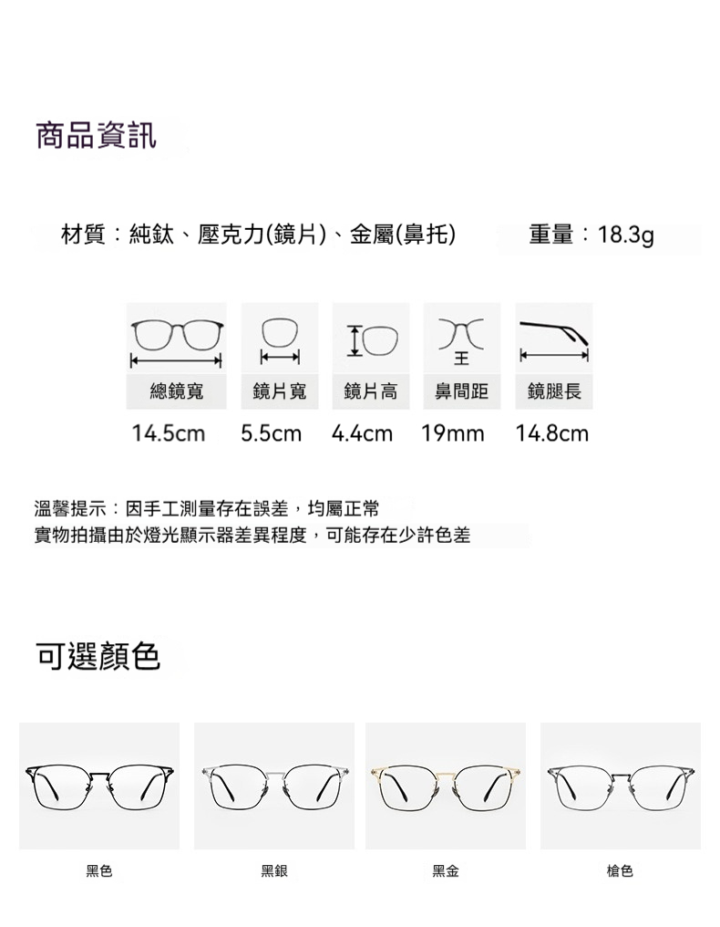 👜商品尺吋:總鏡寬14.5cm,鏡高4.4cm,單鏡寬5.5cm,鼻間距19mm,鏡腿長14.8cm