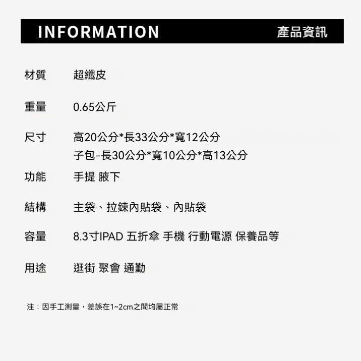 👜尺寸:高20公分*長33公分*寬12公分,子包-長30公分*寬10公分*高13公分