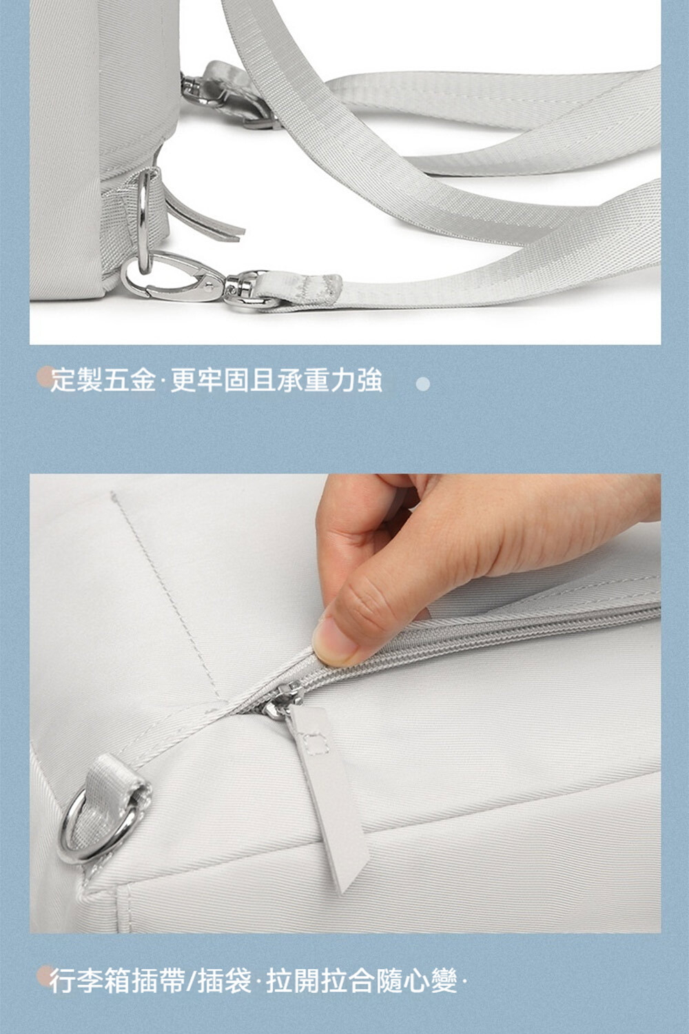 👜結構:主袋、內貼袋*2、緩衝隔層、前置拉鍊袋、側邊拉鍊袋、後幅魔鬼氈袋(下方拉鍊拉開可插行李桿)