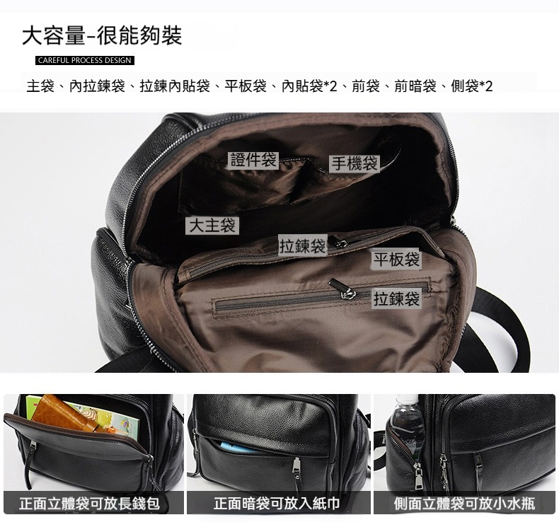 👜結構:主袋、內拉鍊袋、拉鍊內貼袋、平板袋、內貼袋*2、前袋、前暗袋、側袋*2
