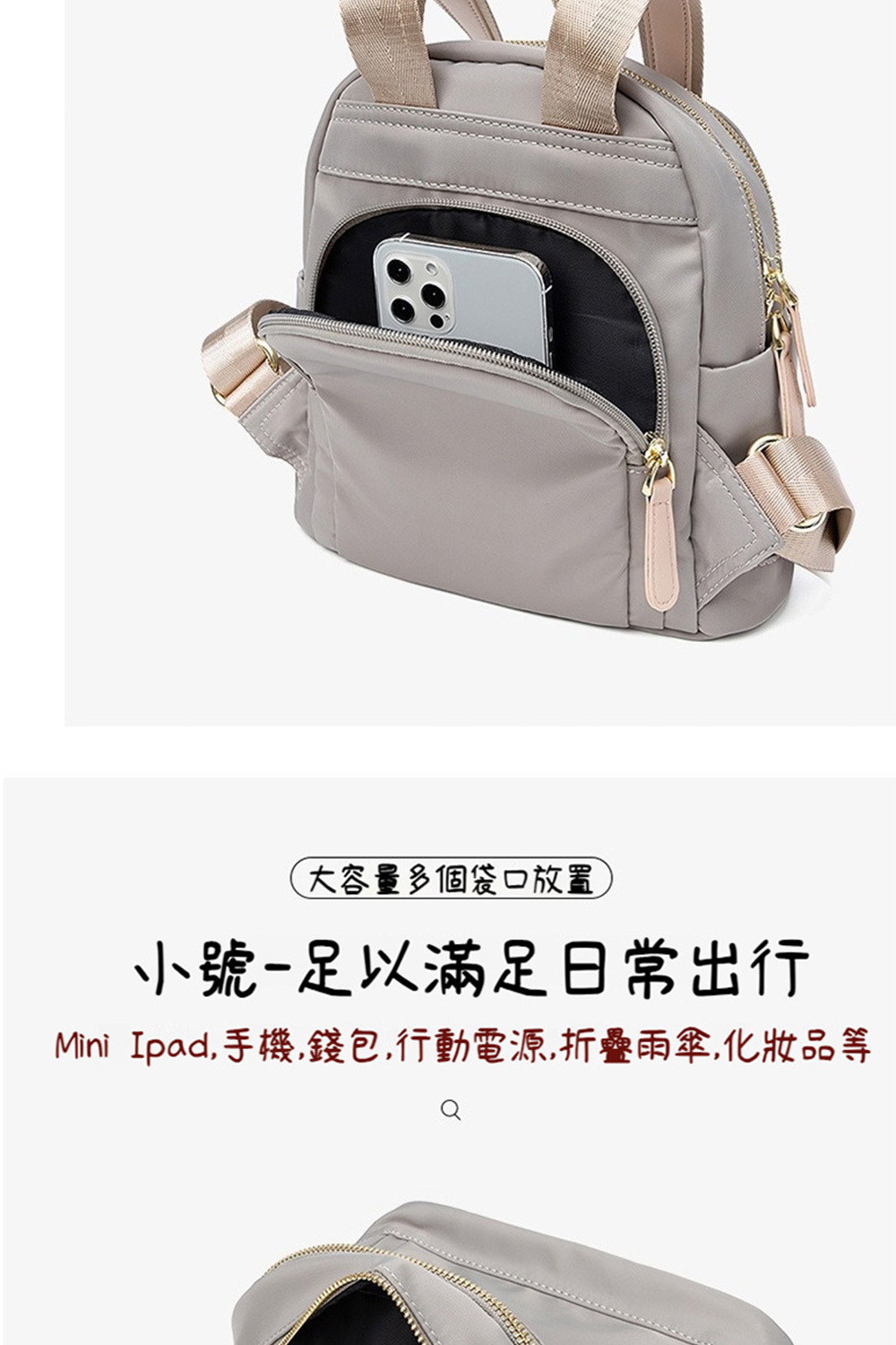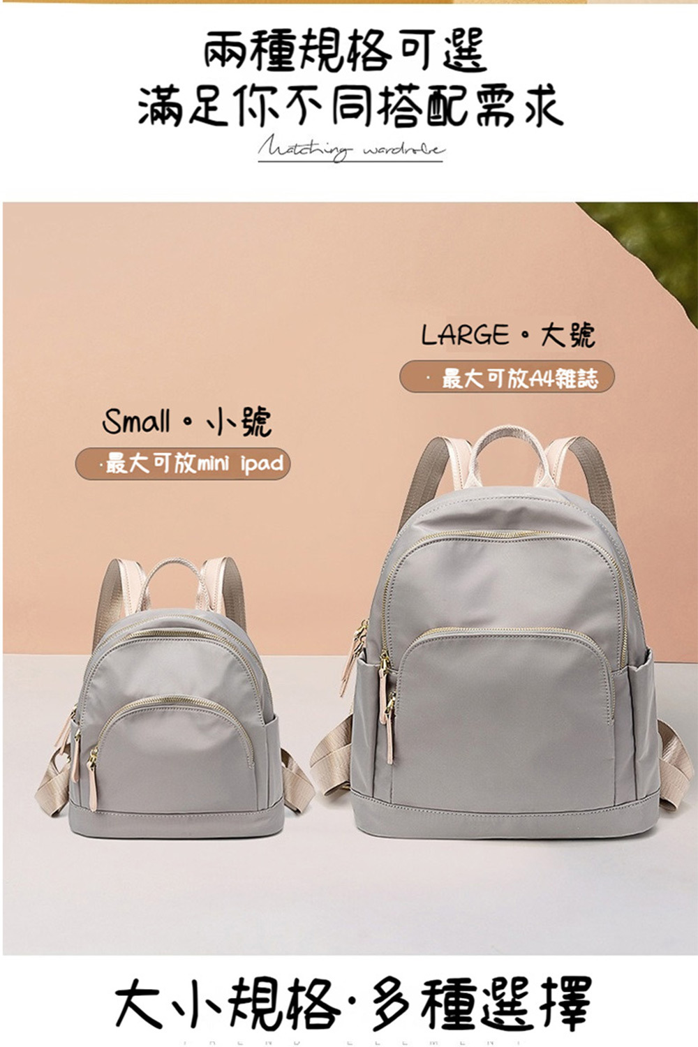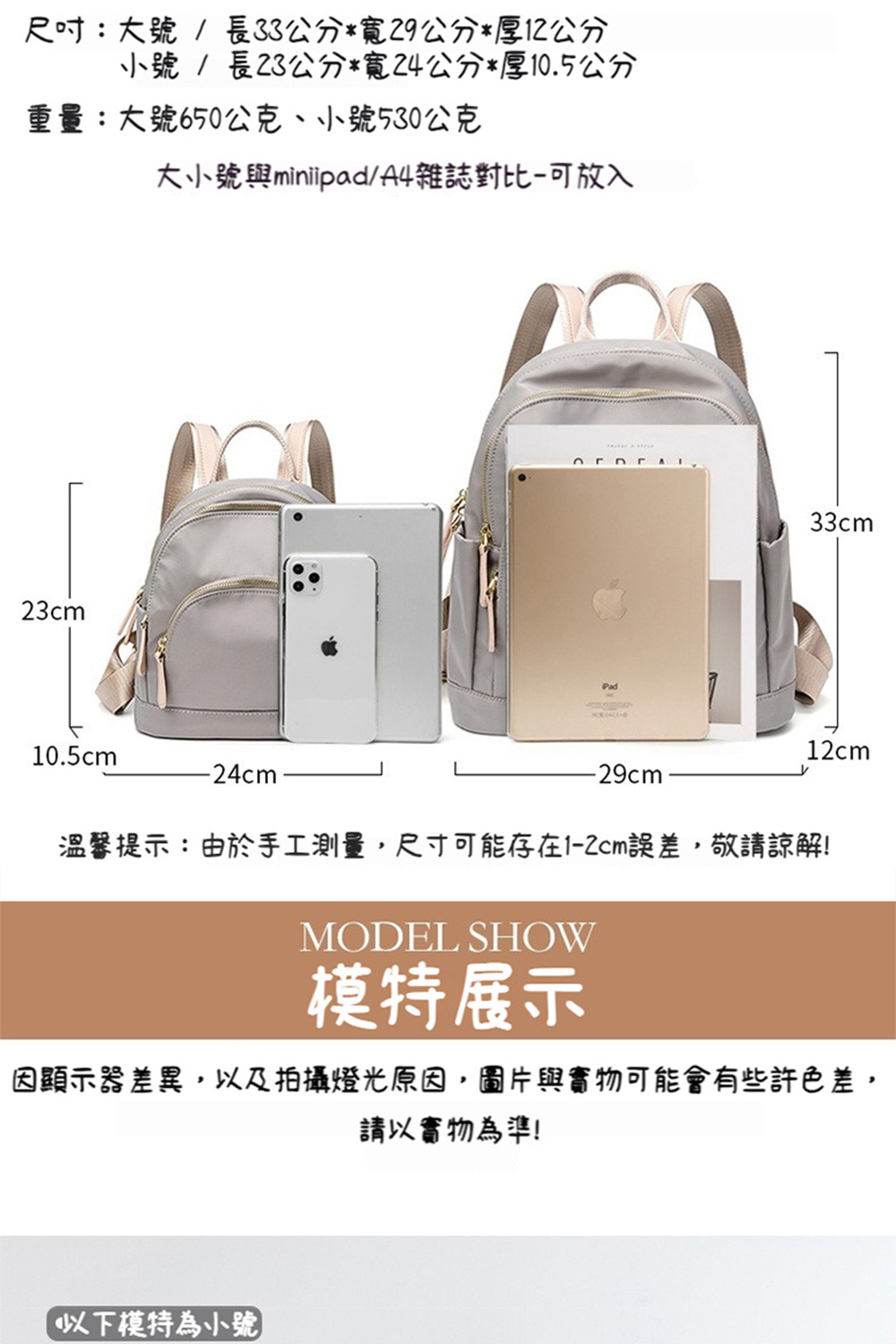 👜容量:小號不可放A4,可放長夾、iPad mini等;大號可放A4