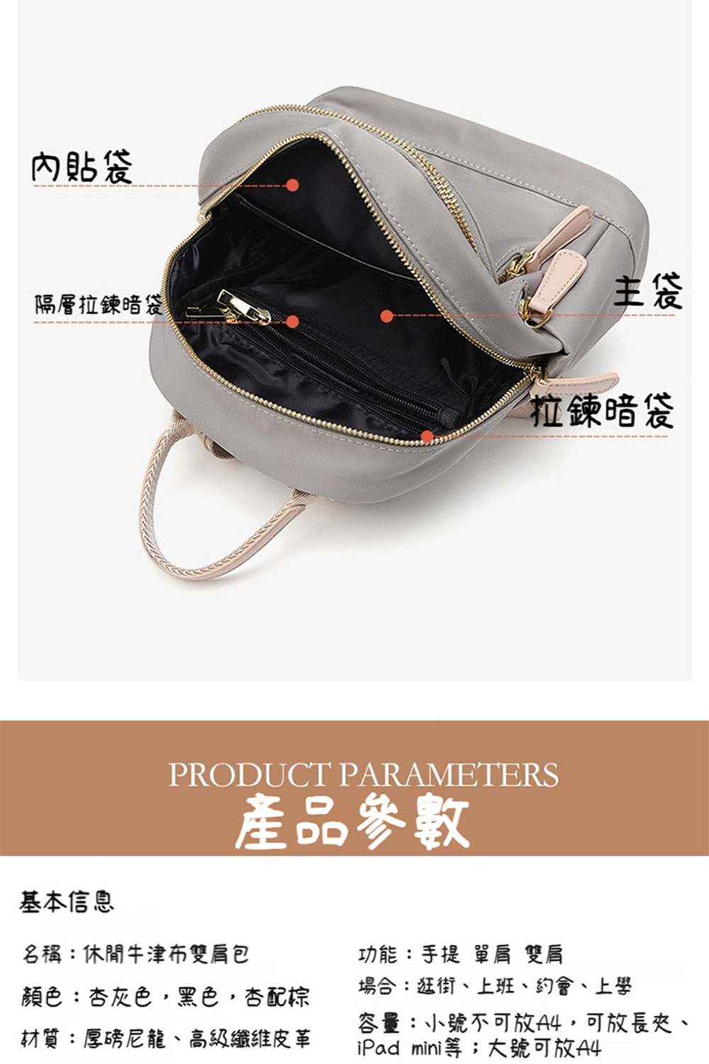 👜材質:厚磅尼龍、高級纖維皮革