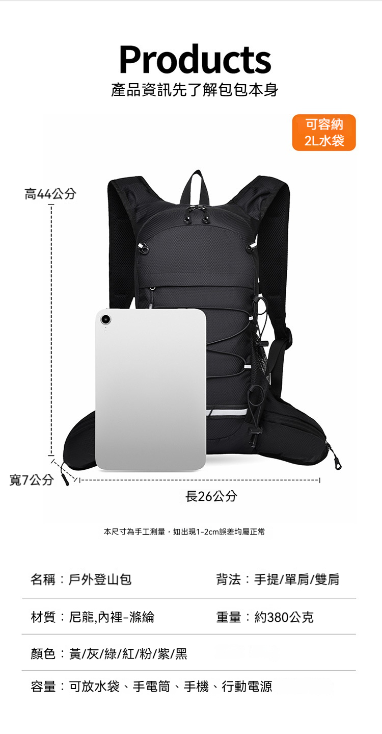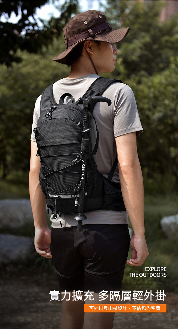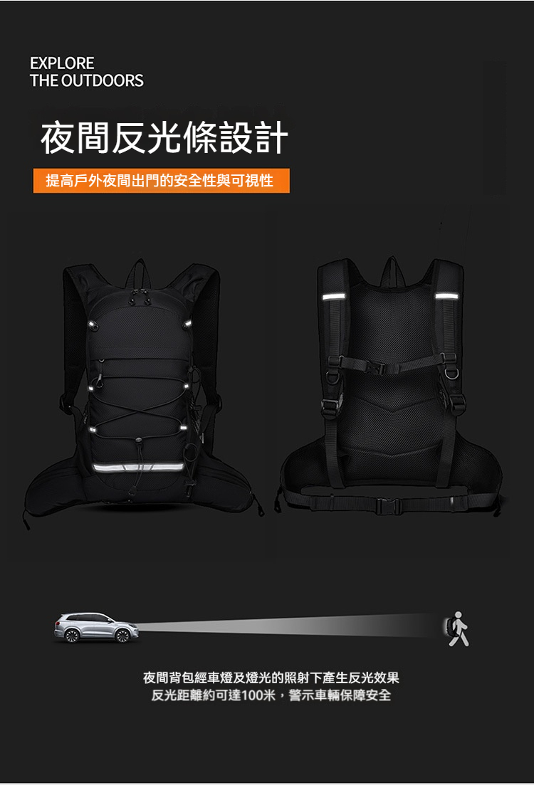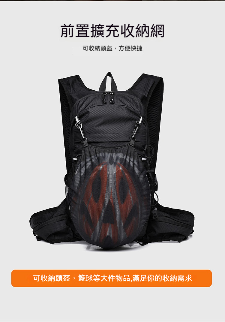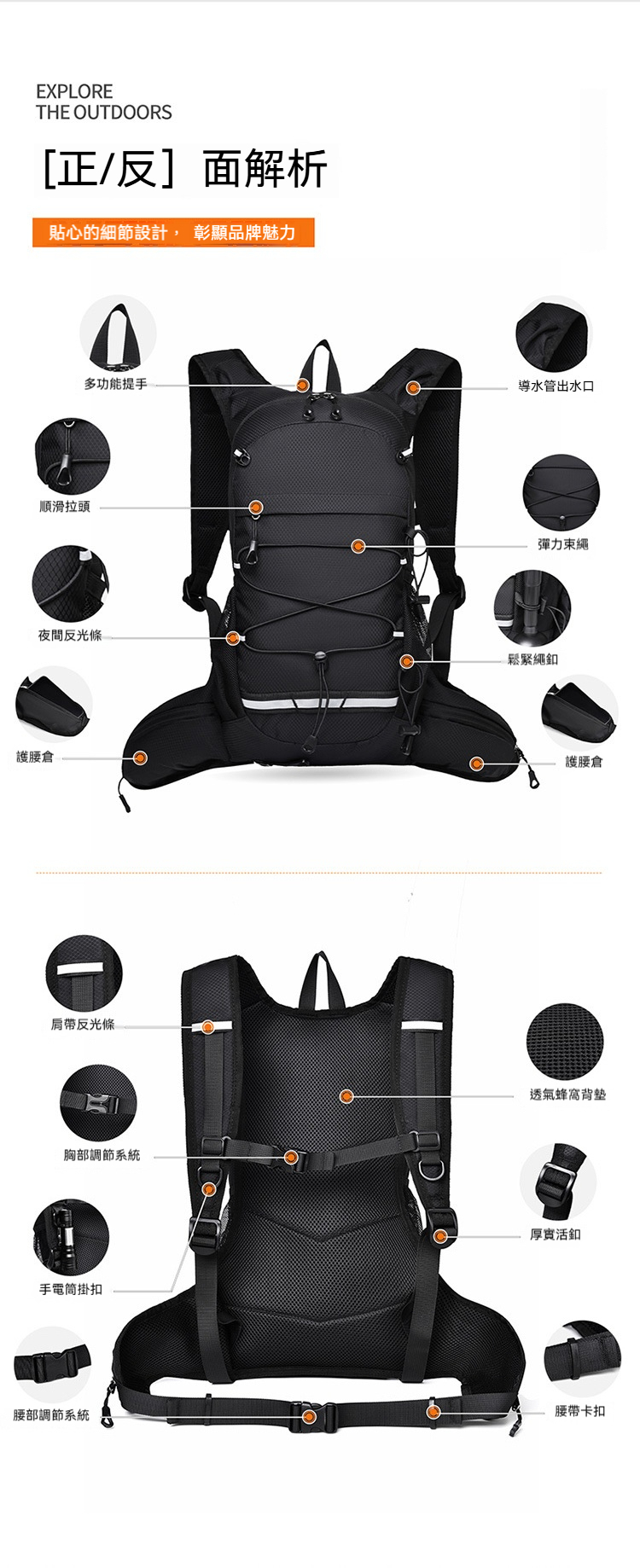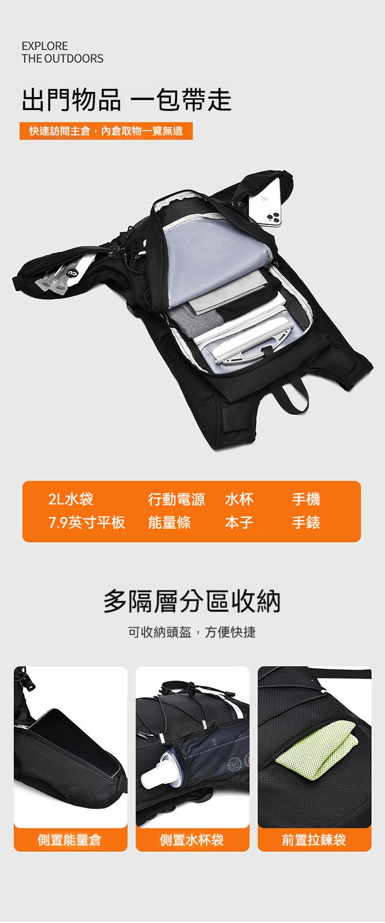 👜結構:主袋、內貼袋、前拉鍊袋、前擴容收納網袋、側袋*2、護腰倉*2